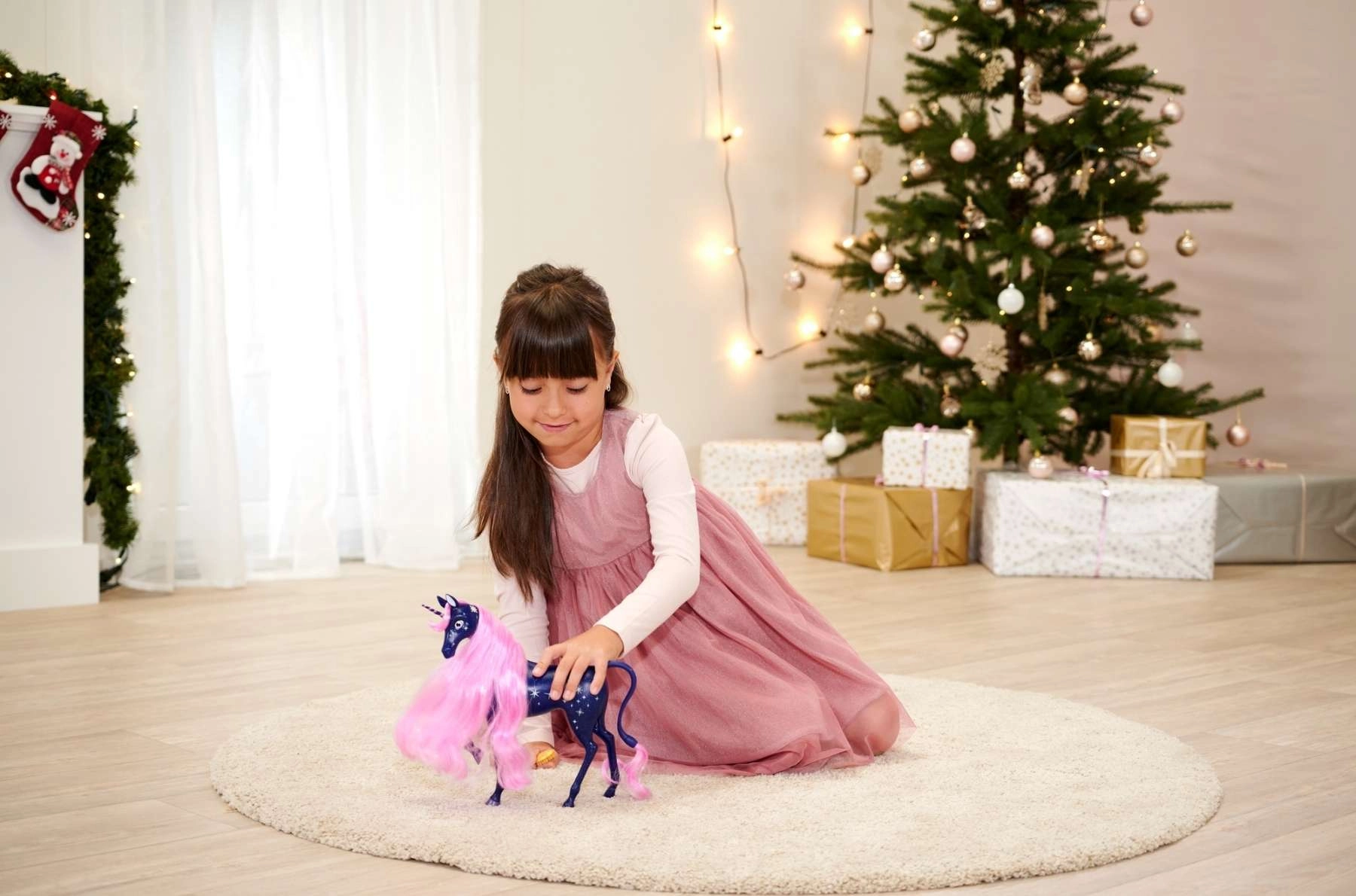 Découvrez la magie de Centopia avec la superbe figurine de licorne étoilée inspirée de la série Mia and Me. Le corps bleu foncé est orné d’une multitude de petites étoiles qui se chargent à la lumière puis brillent magiquement dans l’obscurité – tel un ciel nocturne rempli d’étoiles scintillantes. La longue crinière et la queue roses invitent à la coiffure créative.