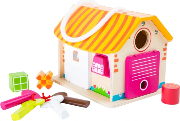 Cette maison en bois est idéale pour exercer les compétences motrices des enfants. Chaque clé correspond à une porte différente. Grâce aux élastiques, elles restent ouvertes. Les briques ont des formes variées qu’il faut insérer dans l’ouverture appropriée. Une cordelette sert au transport de la maisonnette. Principales caractéristiques : contient 9 pièces, entraîne la motricité, couleurs vives