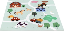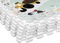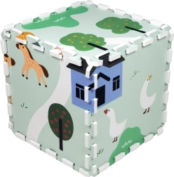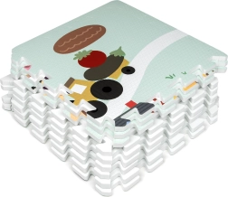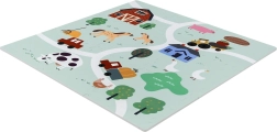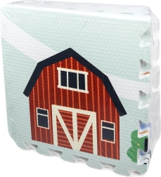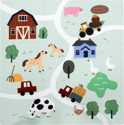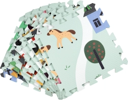 Tapis pour enfants en mousse EVA, doux et sûr, composé de 9 pièces de 30 × 30 cm avec motif de ferme. Offre une isolation contre le froid, un amortissement des chutes et une surface antidérapante. Il est étanche, facile à nettoyer et grâce aux bordures, les pièces permettent de créer une surface plus grande ou des formes 3D (par ex. un cube). Convient dès la naissance, sans phtalates, formamide, PVC ni BPA, conforme aux normes EN 71 et REACH.