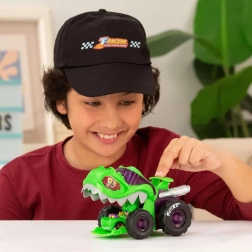 Le grand véhicule T‑Rex avec lanceur fonctionnel propulse la petite voiture en course en une seconde. Espace pour le pilote et roues libres pour une conduite fluide.