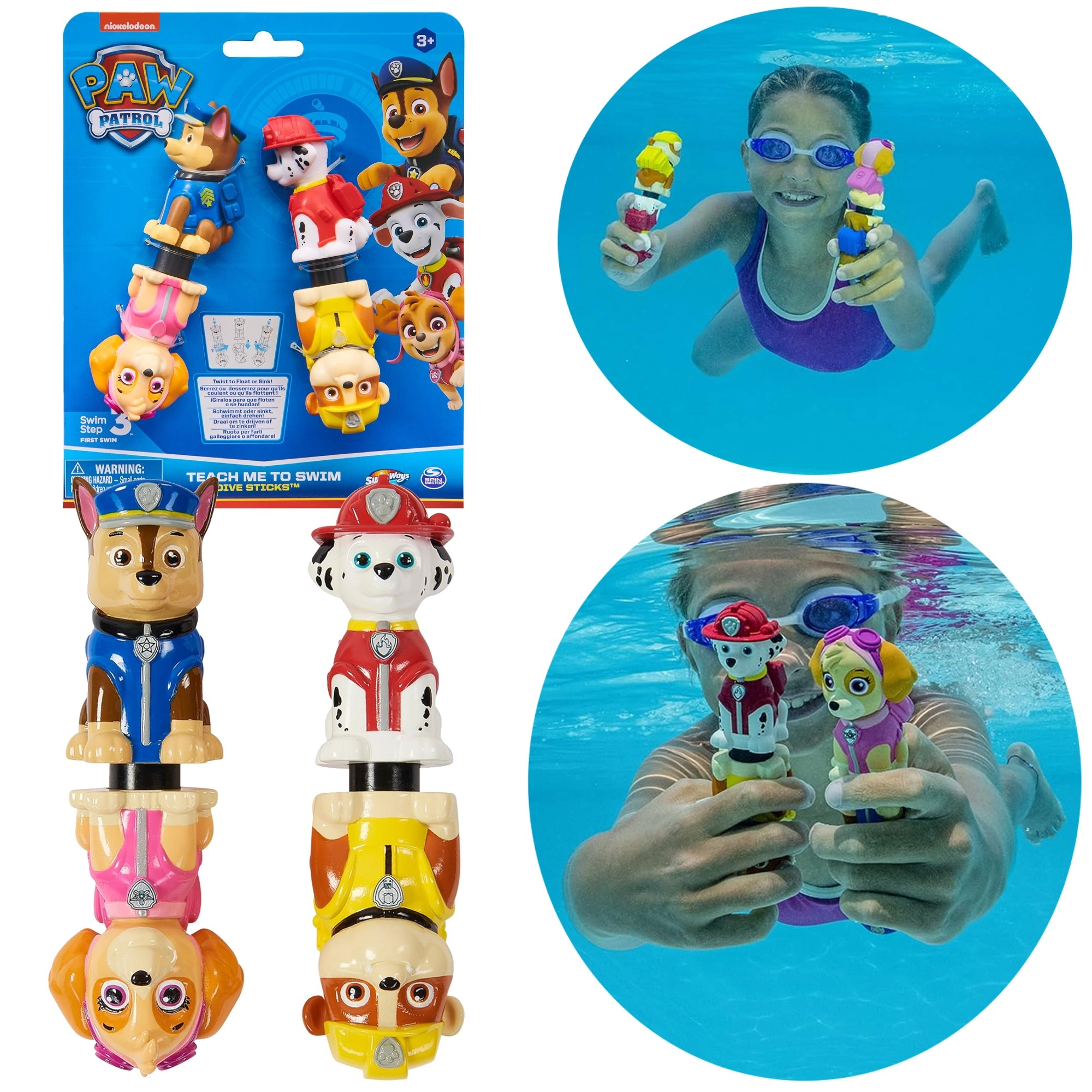Amusants bâtons de plongée avec les héros de PAW PATROL par Spin Master, aidant les enfants à s’entraîner de manière ludique à l’immersion et à l’orientation sous l’eau. D’un simple quart de tour, réglez s’ils doivent flotter à la surface pour les débutants ou couler au fond pour les petits nageurs plus avancés. Les couleurs vives et les personnages appréciés Chase, Skye, Marshall et Rubble garantissent une excellente visibilité et motivent les enfants à bouger dans l’eau.