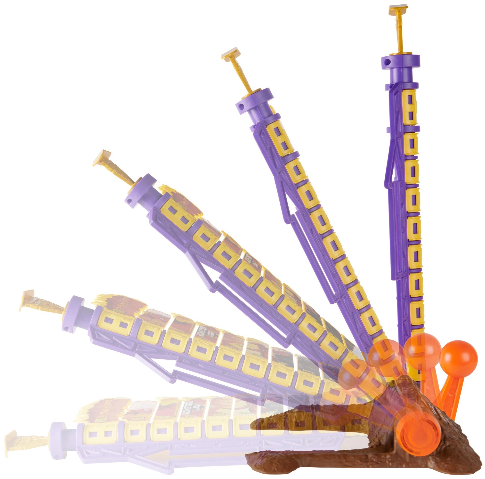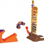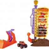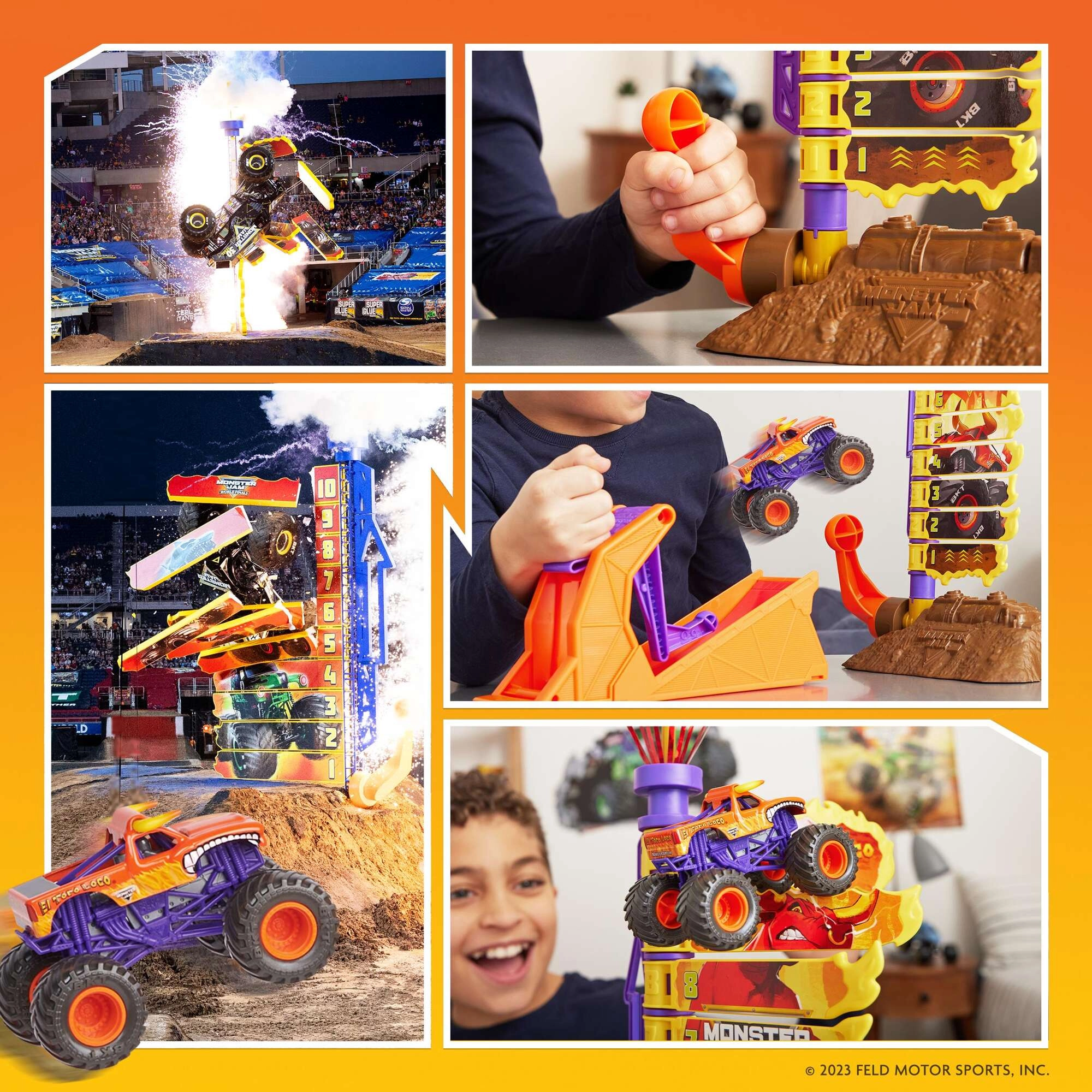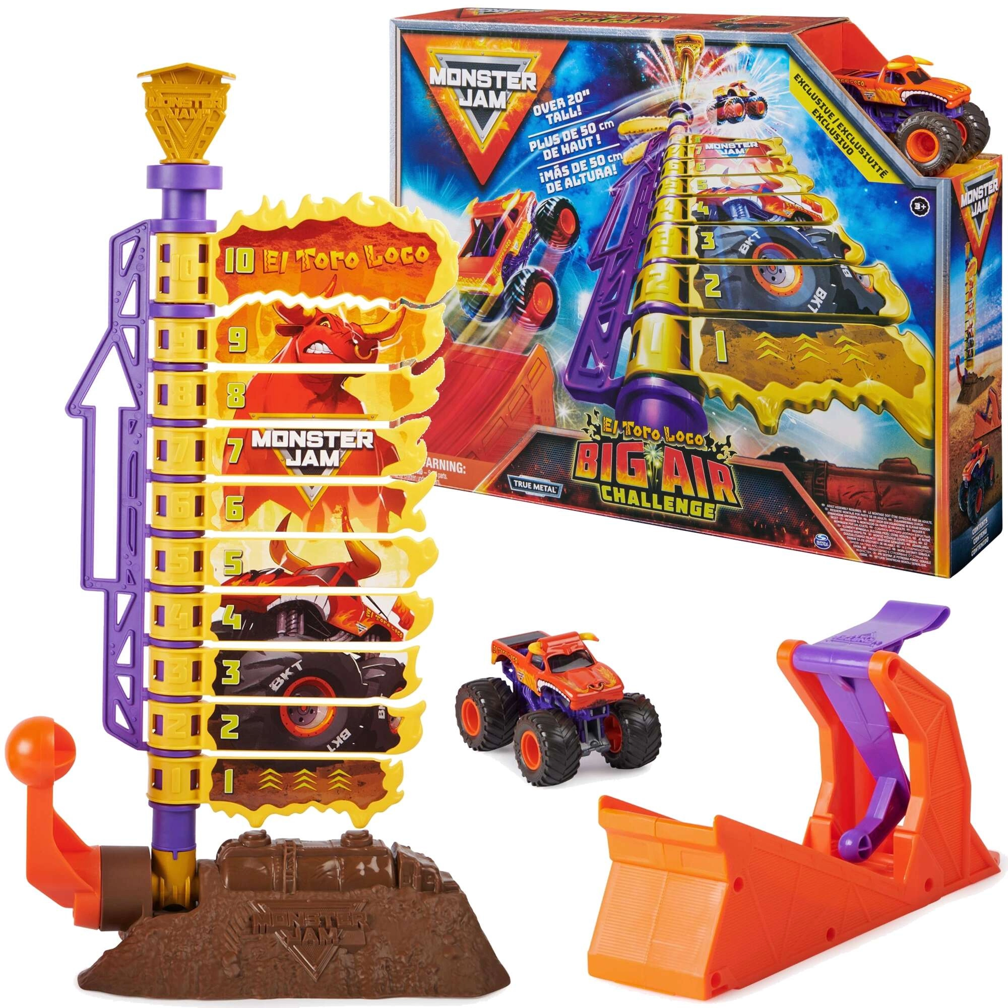 Installez le lanceur, visez et propulsez votre camion EL TORO LOCO vers les hauteurs. La tour de score avec niveaux numérotés montre instantanément jusqu’où vous êtes monté – atteignez le sommet et profitez d’un “feu d’artifice” spectaculaire. Grâce aux 5 angles réglables du lanceur, basculez facilement entre hauteur et distance de saut pour améliorer vos performances.