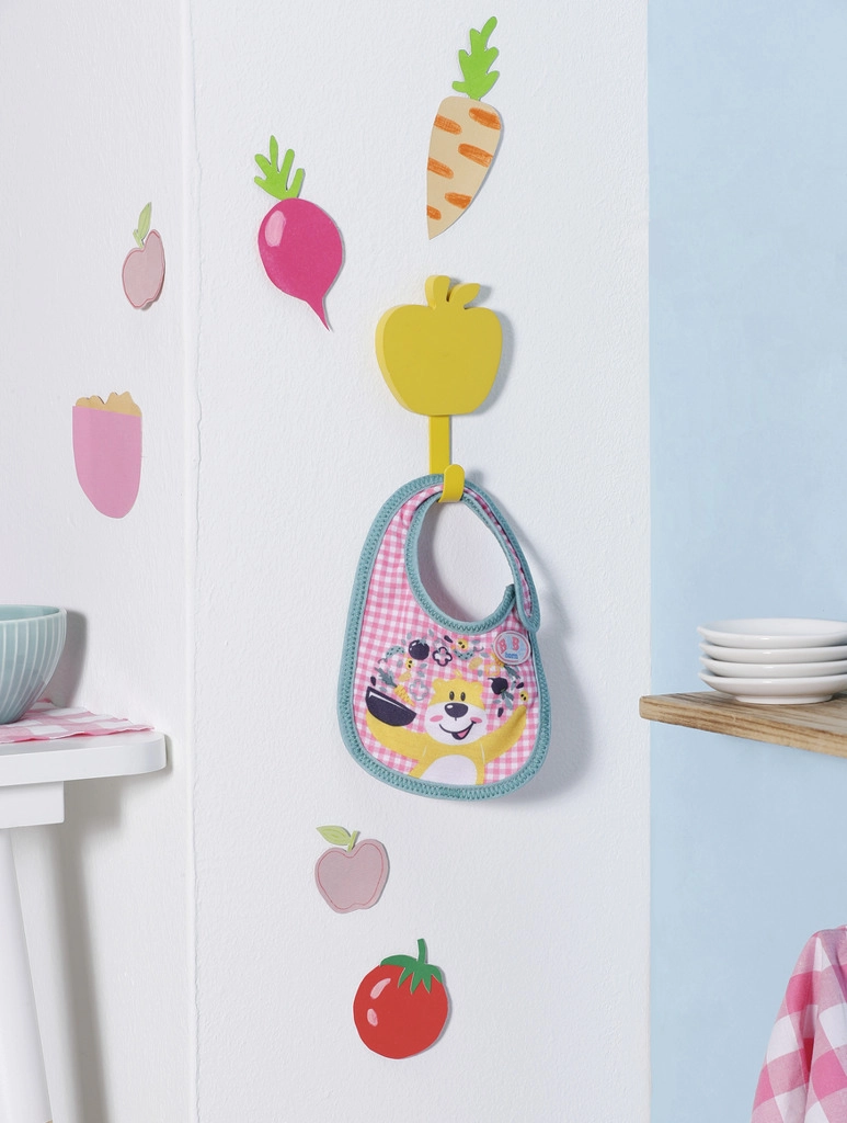 Complétez le trousseau de votre poupée avec un bavoir stylé pour BABY born 43 cm. Deux designs différents raviront les petits et petites soignant·e·s : l’un avec de joyeux légumes et un lapin, l’autre avec un adorable ours chef cuisinier. Les bavoirs sont doux, confortables et protègent les vêtements de la poupée pendant le repas.