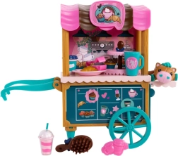 Le chariot dispose de roues pivotantes, d’une poignée et d’étagères pour les douceurs, d’un auvent coloré et d’un graphisme de café. Le set inclut également des accessoires de service et de pâtisserie, un petit compagnon et une brosse pour coiffer la crinière. Tout est conçu pour un jeu de rôle créatif, le développement de la motricité fine et des interactions sociales.