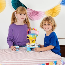 Grand entonnoir, manivelle et goulotte pour verser dans les gobelets font du service en confiserie un jeu d’adresse attrayant qui entraîne la motricité fine.