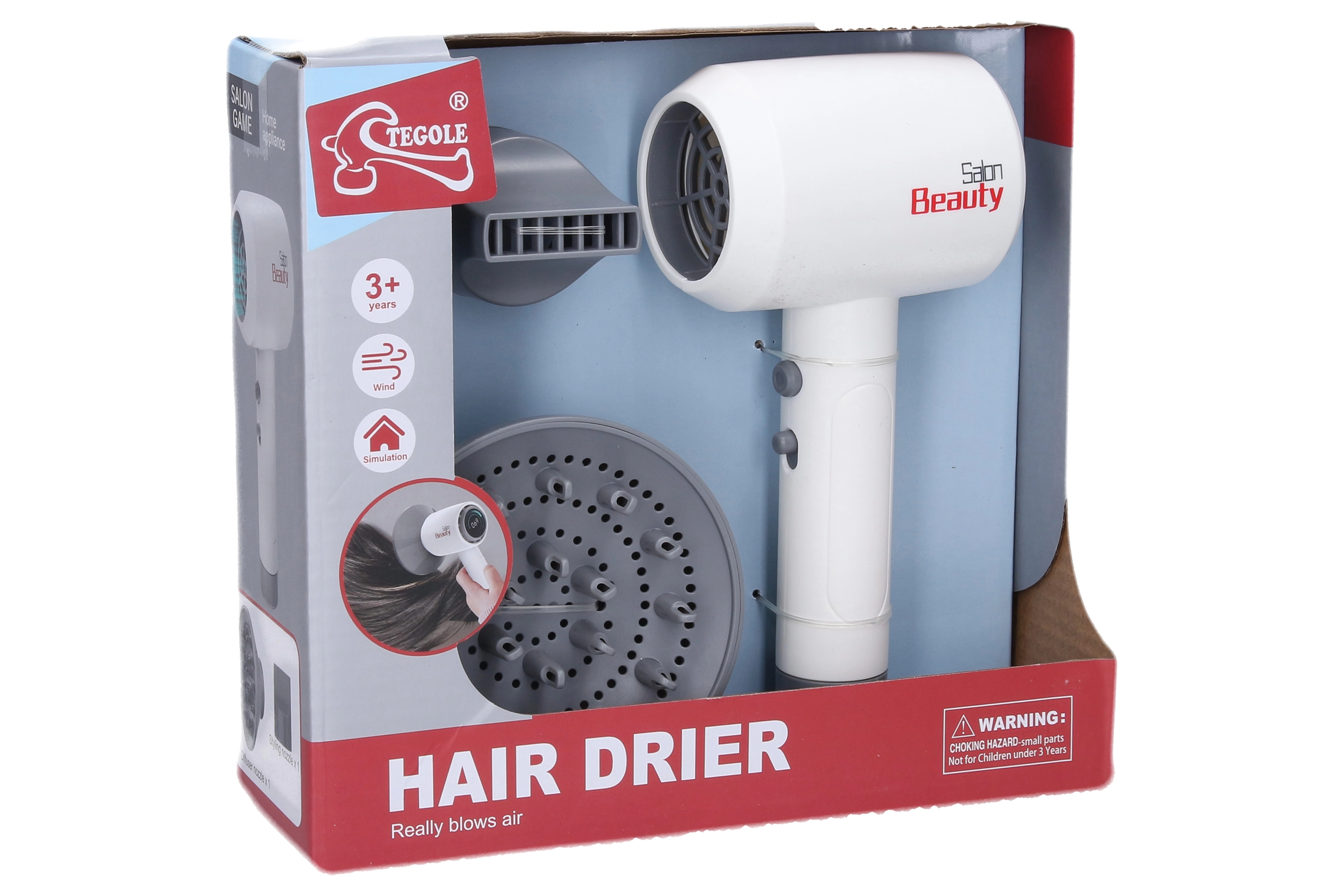 Le jouet est conçu pour un amusement sûr à la maison – il comporte un bouton on/off et un bouton décoratif sans fonction. Le sèche‑cheveux est alimenté par 1× pile AA (non fournie), ce qui permet de l’emporter facilement partout.