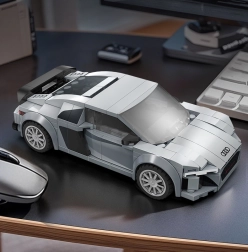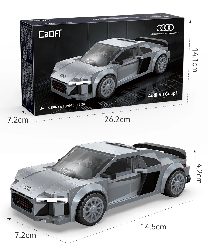 Ce kit licencié CaDA reproduit fidèlement les lignes agressives de la AUDI R8 Coupé (2019). Grâce à des pièces de qualité et à des impressions précises sans autocollants, la proue réaliste avec grille noire, les doubles prises d’air et les flancs épurés se démarquent. Une fois assemblé, le modèle mesure environ 14,5 × 7,2 × 4,2 cm et s’illustre parfaitement sur une étagère ou un bureau.