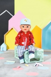 Habillez votre poupée avec une tenue à la mode pour poupées 36 cm alliant confort et style cool. La veste rouge au design asymétrique aspect cuir se distingue par un imprimé ourson dans le dos, tandis que le pantalon sarouel gris‑bleu et les baskets bleues complètent le look sportif. La casquette avec l’imprimé du caneton de course Berta ajoute une touche ludique.