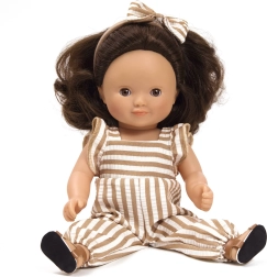 La tenue à rayures, le bandeau assorti et les sandales confortables donnent à la poupée un style unique. Les traits réalistes et les cheveux bruns favorisent un jeu empathique et attentionné, qui développe les compétences sociales.