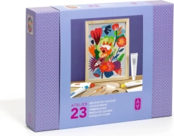 Palette en bois, tubes de peinture acrylique et motifs pré-dessinés vous permettent de créer dès l’ouverture de la boîte.