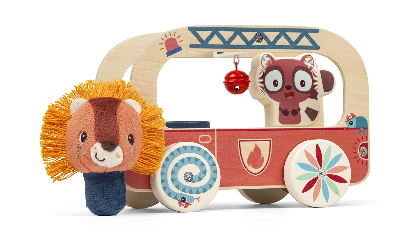 Offrez à votre tout-petit ses premières aventures avec le camion de pompiers en bois Lilliputiens. En roulant, un petit ami animal tourne à l’intérieur et vient effleurer la clochette suspendue, dont le joyeux tintement stimule l’ouïe, les capacités de coordination et l’imagination. Grâce à ses roues qui tournent en douceur, le véhicule est facile à manœuvrer et la corde peut être détachée à tout moment.