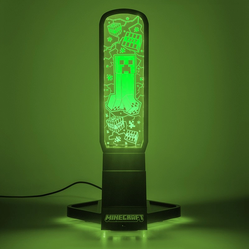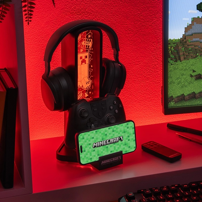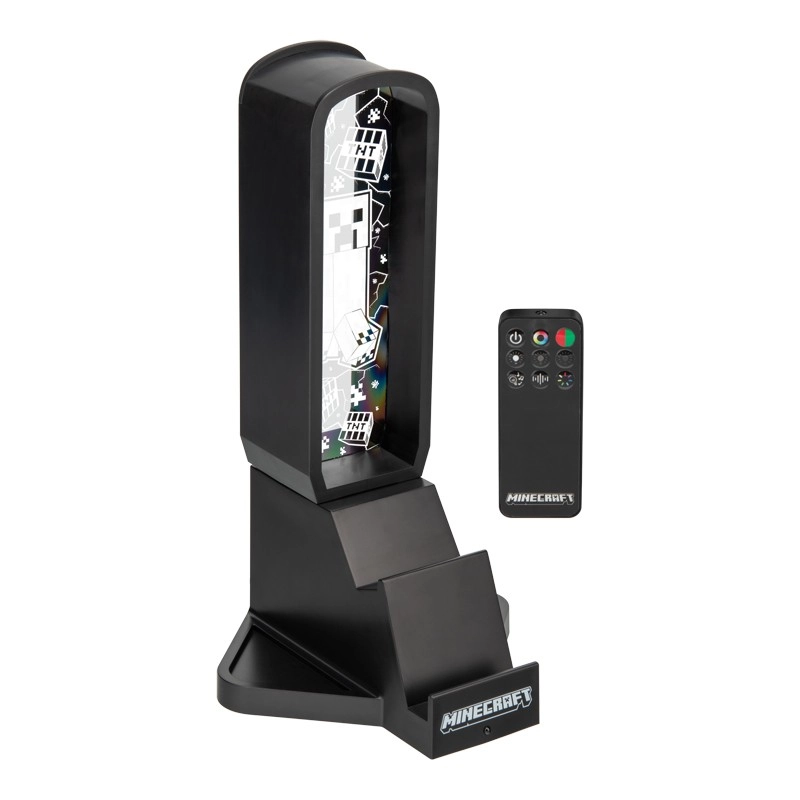 Un support pour casque stylé inspiré de l’univers Minecraft, haut de 30 cm, doté de modes lumineux multicolores, d’un support pour téléphone pratique et de deux ports USB‑C pour recharger vos accessoires. Le contrôle est facile grâce à la télécommande et à l’alimentation via câble USB inclus.