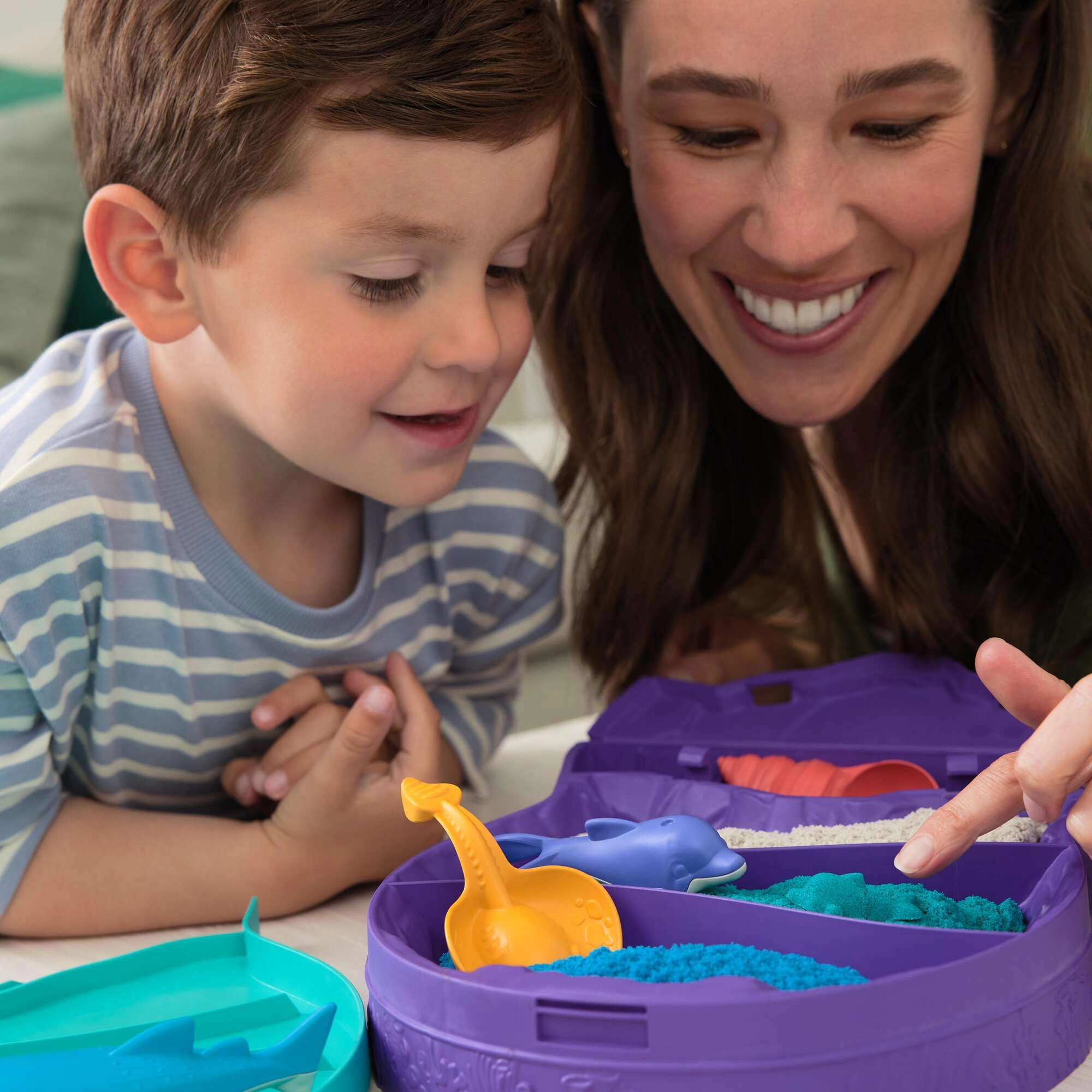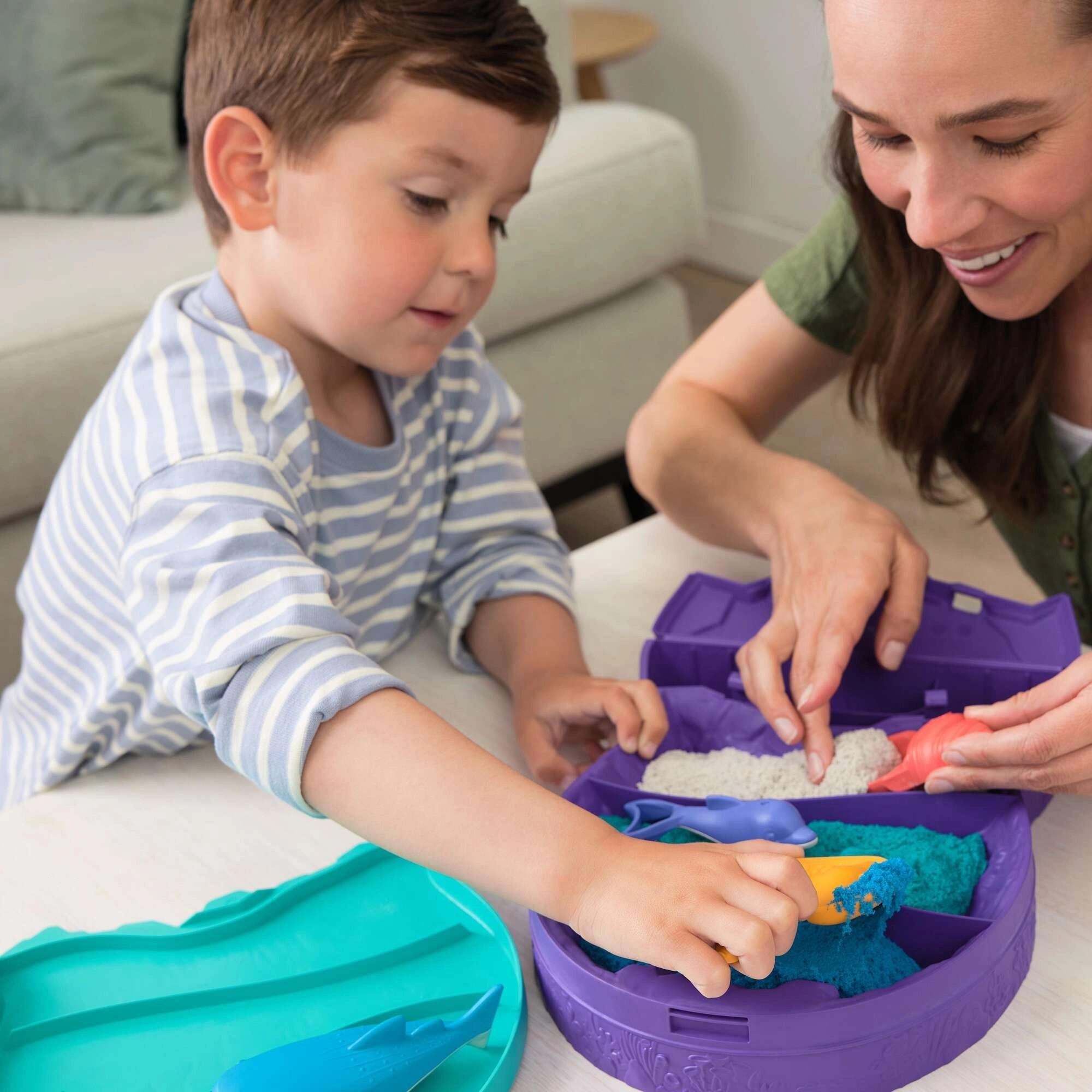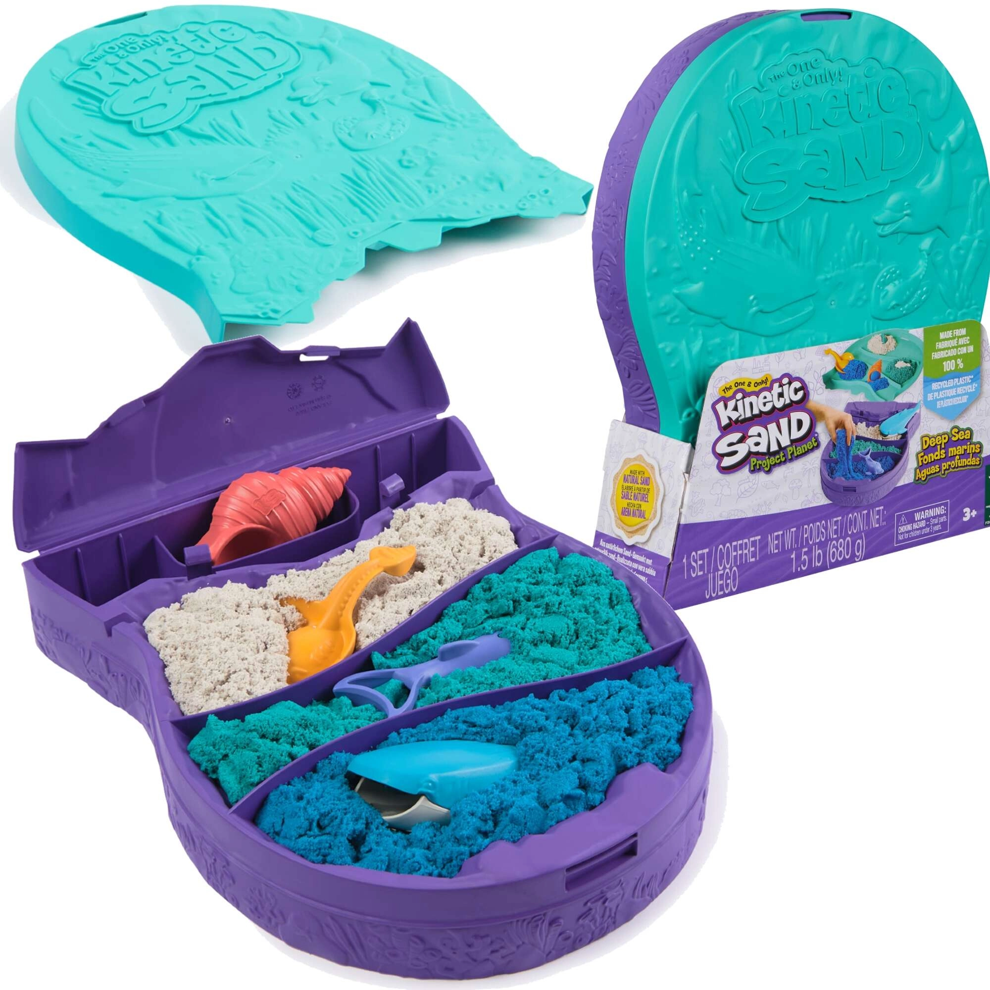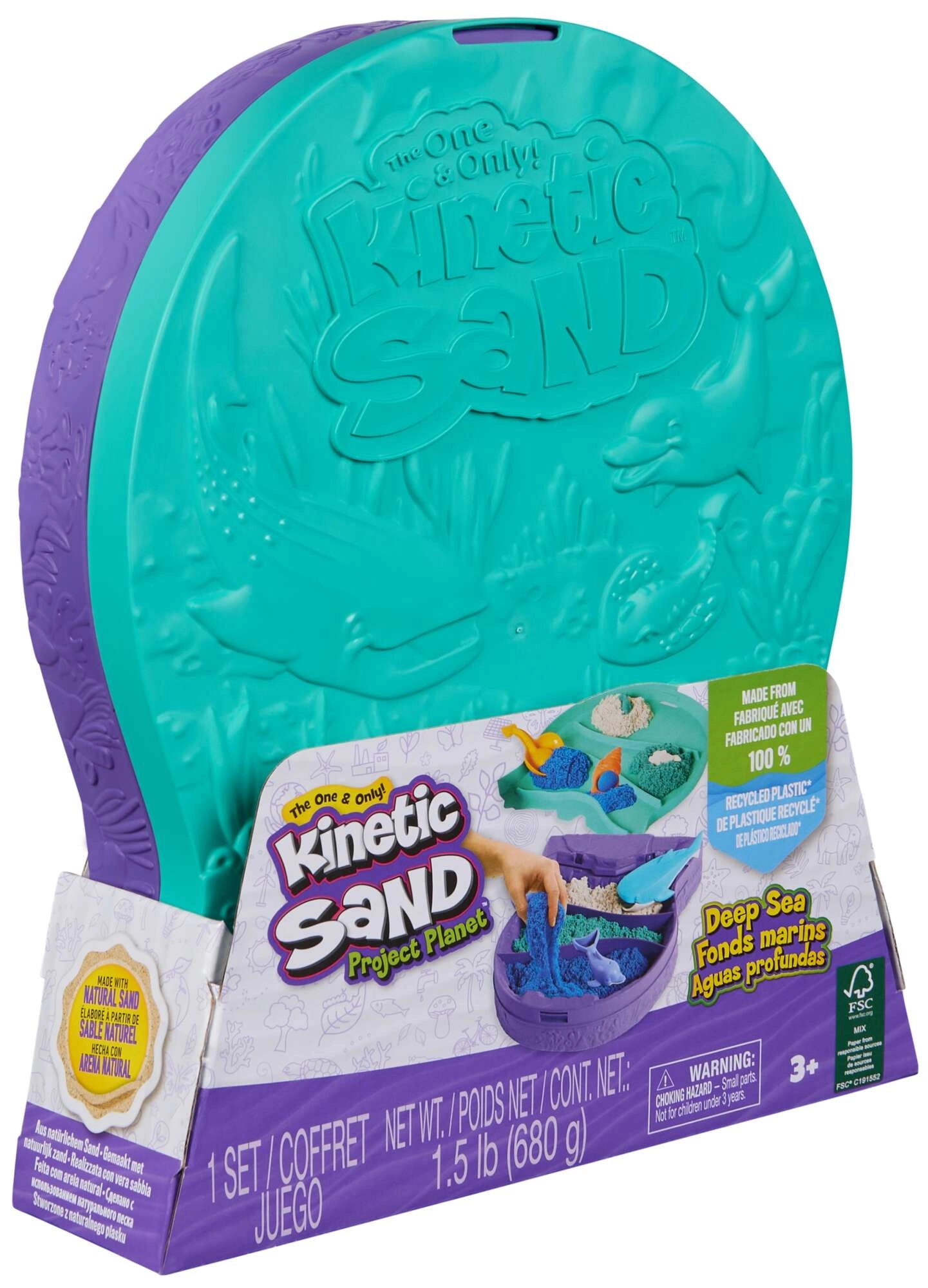 Le sable cinétique Kinetic Sand reproduit la sensation du sable mouillé, sans salissures ni dessèchement. Les enfants peuvent facilement modeler, couper, presser et construire tout en entraînant leur coordination et leur créativité. Le set Deep Sea propose une combinaison de bleu, blanc et vert pour créer des scènes et des formes sous-marines amusantes.