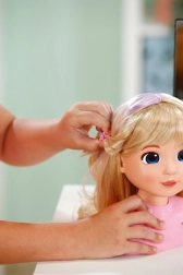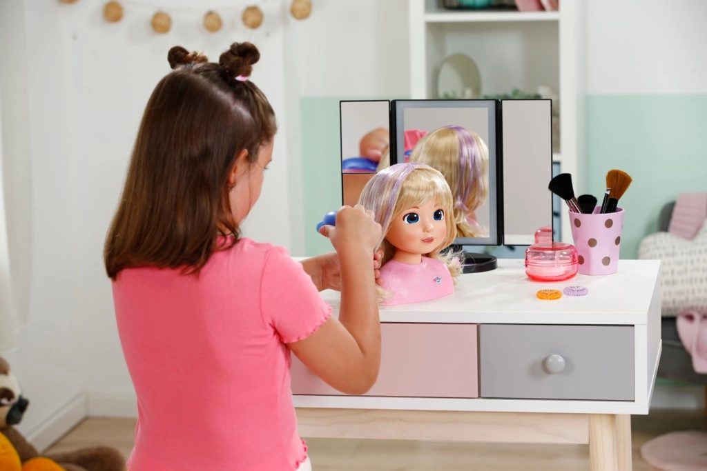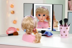 Le socle stable assure un coiffage confortable sur la table ou la coiffeuse. Les accessoires inclus – brosse, barrettes et élastiques – développent la motricité fine et apprennent les bases des soins capillaires par le jeu. Une excellente idée cadeau pour petites stylistes dès 3 ans.