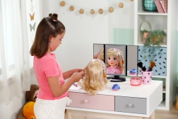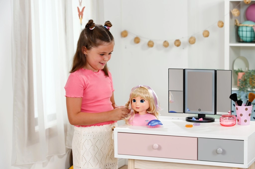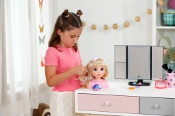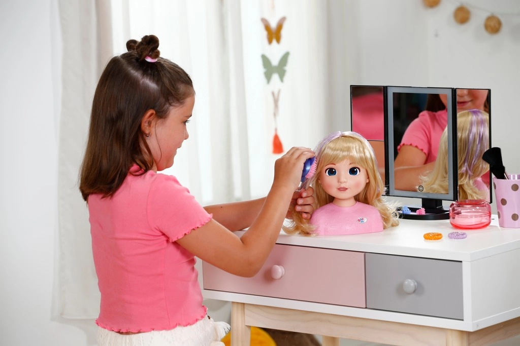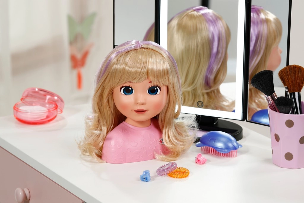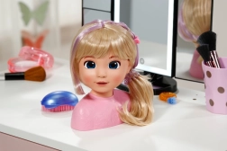 La tête à coiffer Baby Born Carla ouvre aux enfants un monde de créativité et d’imagination. De longs cheveux en nylon, doux et résistants, tiennent parfaitement les coiffures, se démêlent facilement et invitent à tester sans cesse de nouveaux styles – des queues-de-cheval simples aux tresses élaborées.
