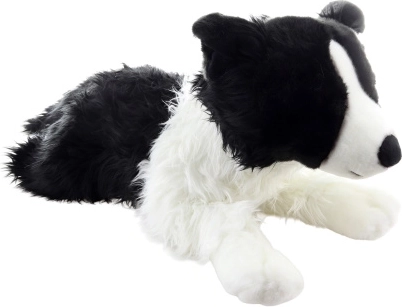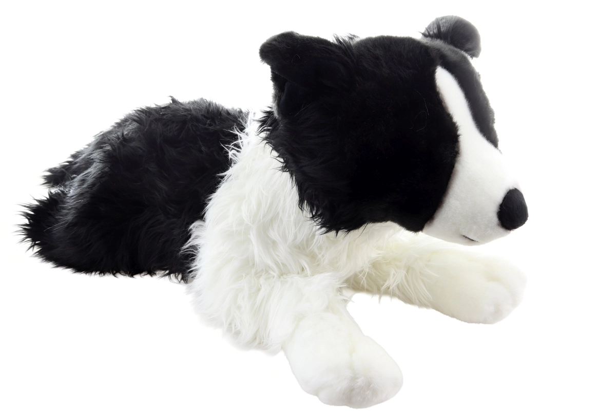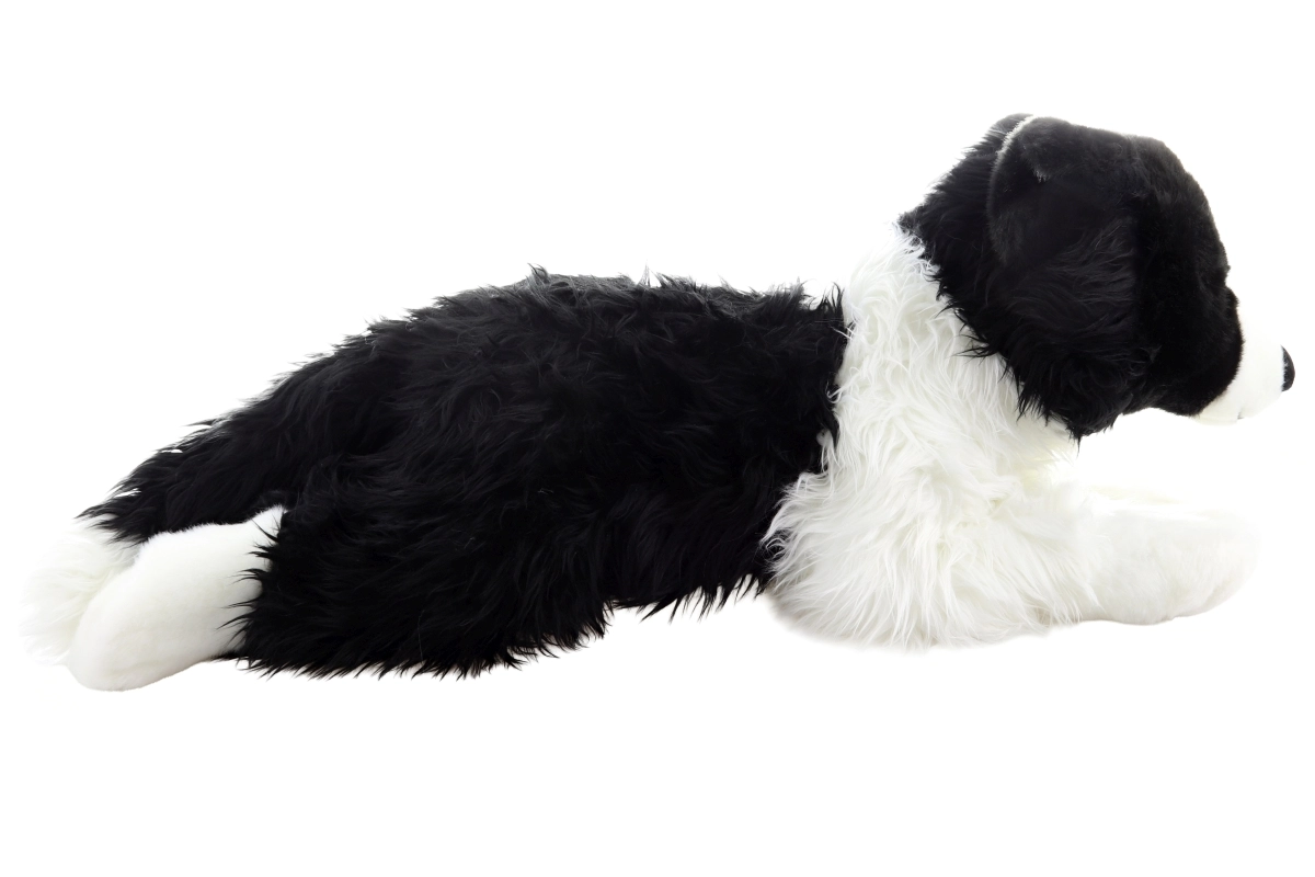 Ce grand chien en peluche Border Collie en position allongée séduit dès le premier toucher. Il est fabriqué dans un matériau très doux et agréable au toucher, invitant aux câlins. La combinaison réaliste de fourrure noire et blanche et ses oreilles mignonnes donnent au jouet une apparence authentique.