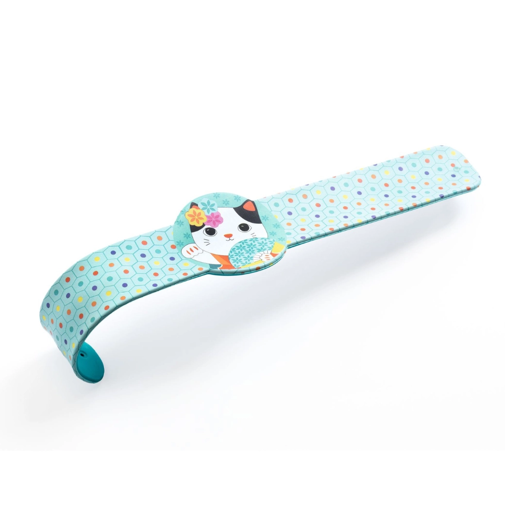 Les adorables bracelets snap DJECO sont un accessoire ludique pour enfants. Grâce à la bande flexible, ils s’enroulent rapidement et en douceur autour du poignet d’un simple tapotement et tiennent toute la journée. Les imprimés colorés et l’ornement en relief en forme de chat, de cœur ou de lapin apportent une touche de magie à la tenue.