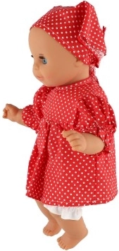 Adorable poupée bébé avec un corps en tissu et une longueur de 30 cm, qui ravira chaque petite maman. La robe rouge à pois blancs stylée et le foulard assorti stimulent l’imagination et le jeu d’imitation. Livrée dans une boîte 20 × 35 × 13 cm.