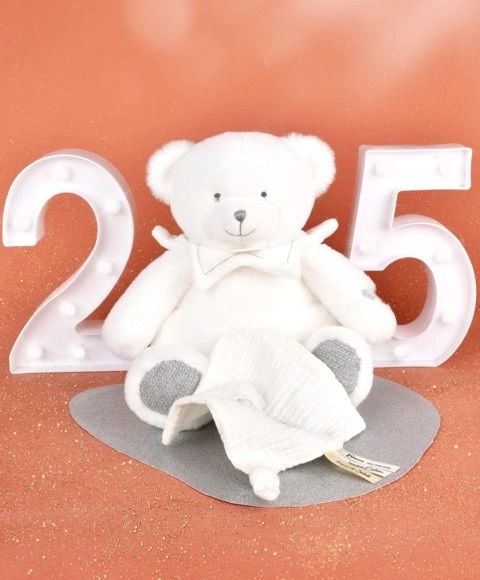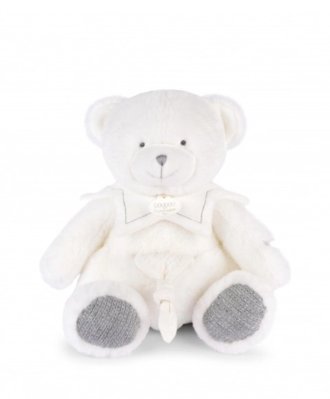 Ce tendre ourson accompagné d’une couverture doudou réconfortante ravira les bébés et leurs parents. La couverture est ornée d’une délicate broderie de la marque DOUDOU et de rubans satinés aux messages pleins d’amour, instaurant un rituel tout en douceur avant le coucher. Grâce à la possibilité de ranger la couverture dans le ventre de l’ourson, l’ensemble est parfait en voyage et facile à garder propre.