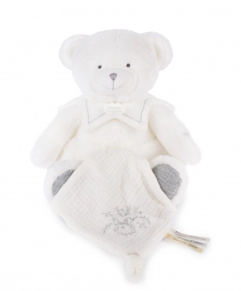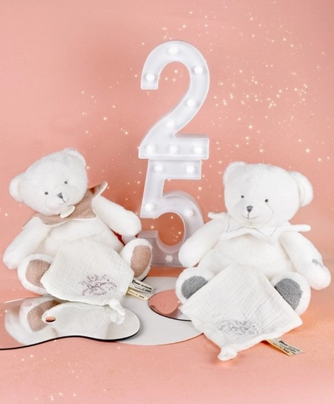 Matière moelleuse, broderie DOUDOU et rubans satinés porteurs de tendres messages créent un sentiment de sécurité et de bien-être pour les câlins du quotidien.