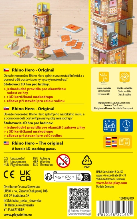 Rhino Hero (CZ) de HABA est un jeu d’adresse dynamique où vous construisez, à partir de cartes, un gratte-ciel à la fois le plus haut et le plus stable possible. Chaque étage est un défi – une seconde d’inattention et la tour peut s’effondrer. Des règles courtes et des manches rapides en font un choix parfait pour les familles, les amis et les débutants.