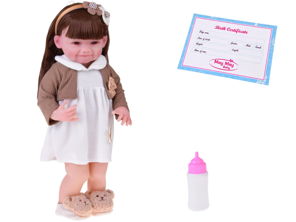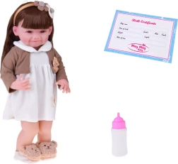 Cette belle poupée porte une petite robe blanche avec appliqué fleuri et un gilet brun avec petit nœud. La tenue est complétée par de douilles pantoufles en forme d’oursons et un serre-tête beige orné, qui soulignent son look tendre et enfantin. Grâce à son visage réaliste et à ses longs cheveux, les enfants profiteront d’heures de jeu créatif.