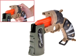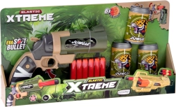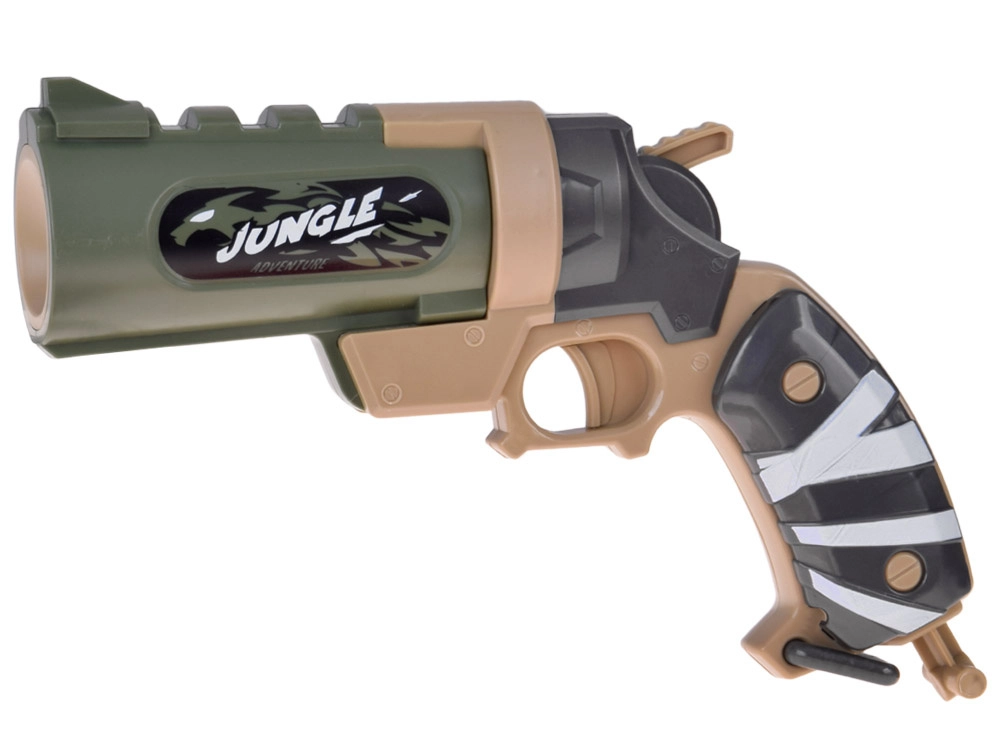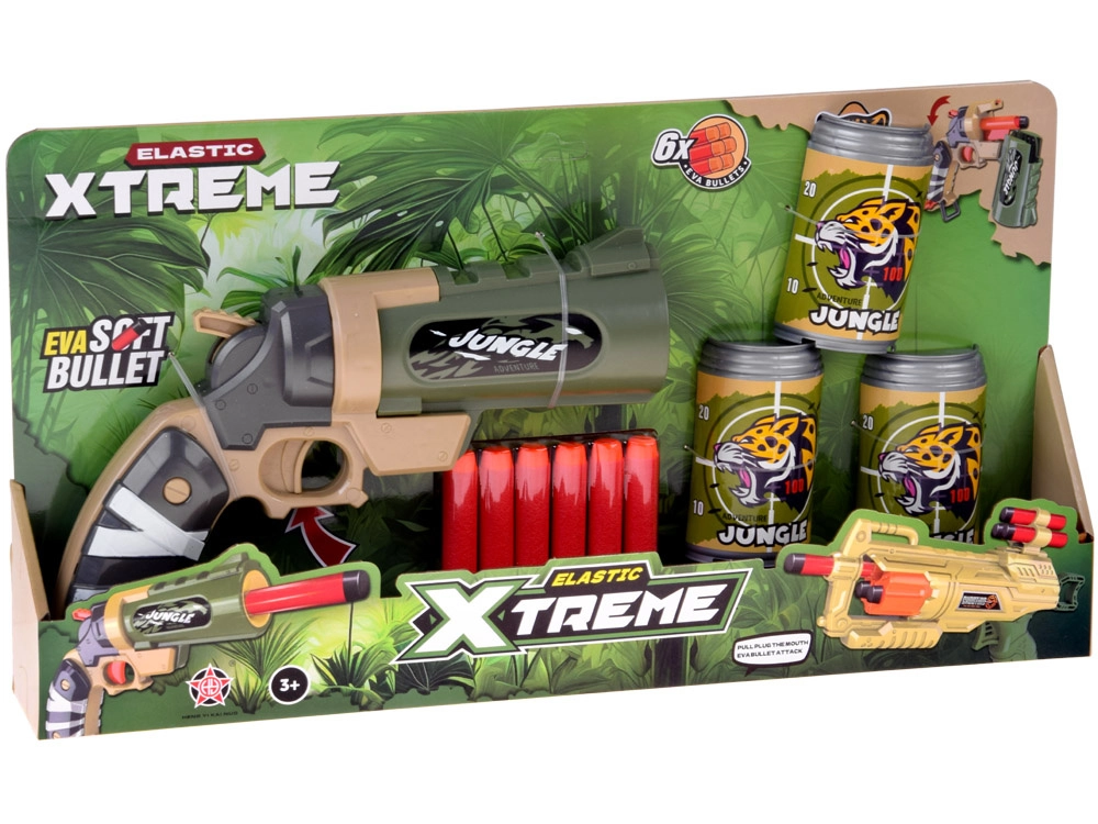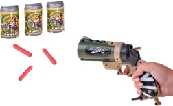 1× pistolet JUNGLE, 6× projectile en mousse (embout en caoutchouc), 3× cible en plastique – canette
