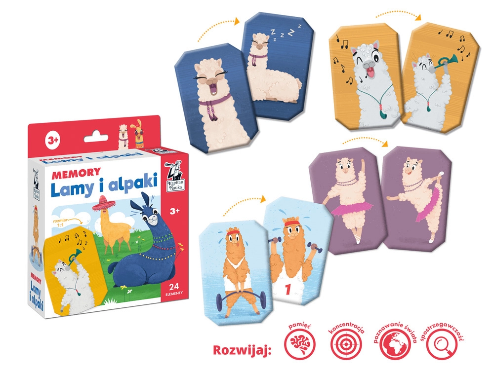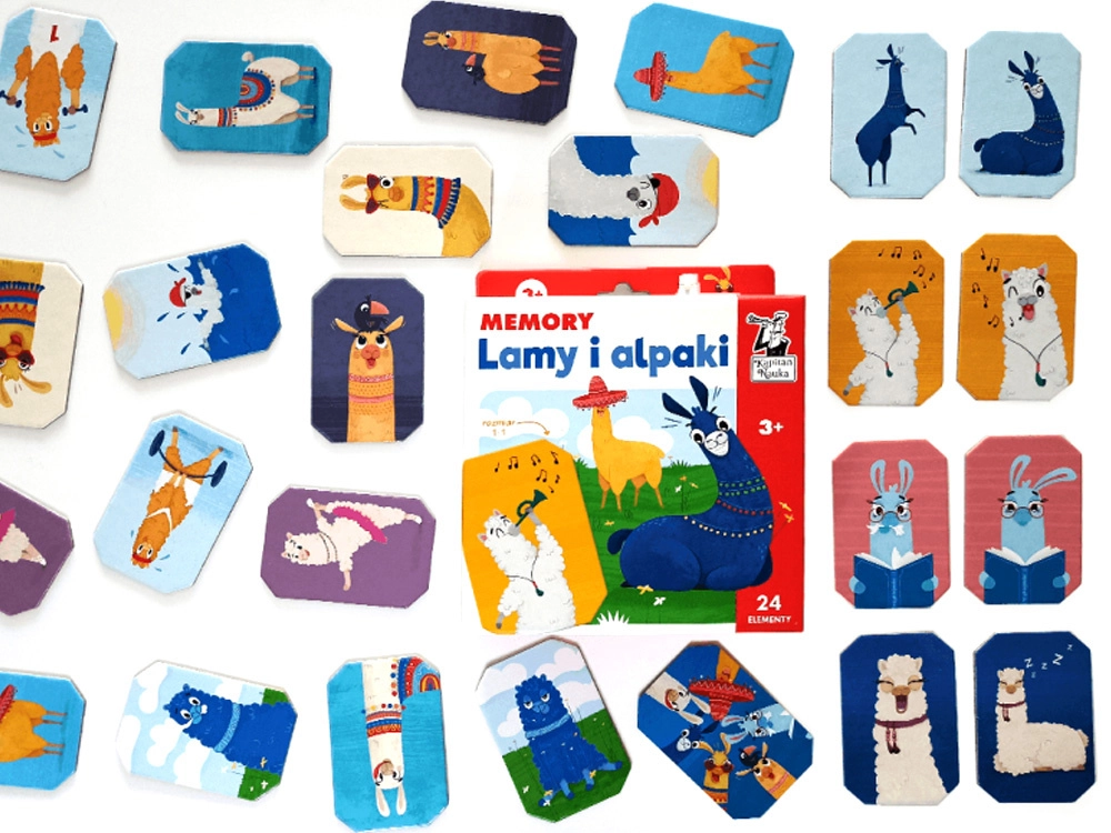 Un jeu de mémo amusant avec des lamas et des alpagas sympathiques pour enfants dès 3 ans. Le jeu développe la mémoire, l’attention et la concentration lors de la recherche des paires. Le coffret contient 24 cartes (12 paires) d’environ 9 × 6 cm avec des illustrations joyeuses – ballerine, musicien, pirate et bien d’autres.