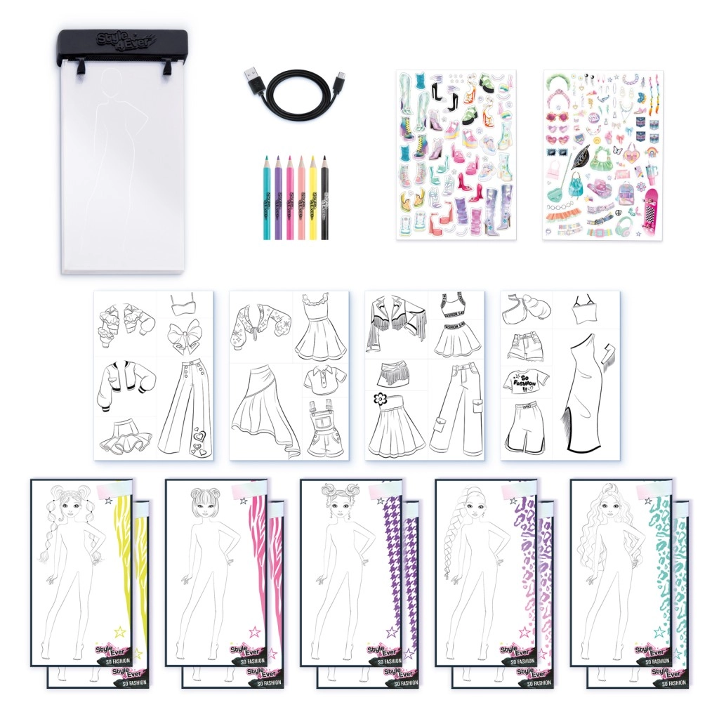 Découvrez le monde créatif de la mode avec le kit Style4Ever – kit de stylisme avec tablette lumineuse, offrant aux enfants des heures de divertissement créatif. Créez vos propres designs de mode à l’aide de pochoirs, de mannequins, d’autocollants et de crayons de couleur. Un câble USB‑C est inclus pour une recharge facile. Convient aux enfants à partir de 6 ans.