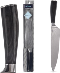 Couteau de chef universel en acier damassé de 33,5 cm avec une lame de 20 cm, offrant une coupe et hachage précis des fruits, légumes et viandes. Manche ergonomique en bois pakka qui tient parfaitement en main, résistant à l’humidité et aux produits chimiques. 67 couches d’acier garantissent une acuité, une durabilité exceptionnelles et un motif caractéristique sur la lame. Convient à un usage domestique et professionnel.