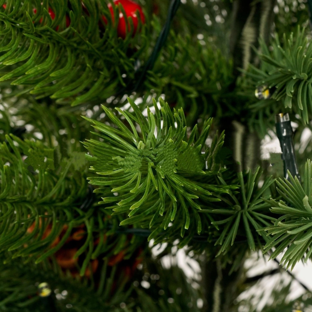 Le feuillage dense est complété par des baies rouges et des pommes de pin naturelles pour un rendu authentique et traditionnel.