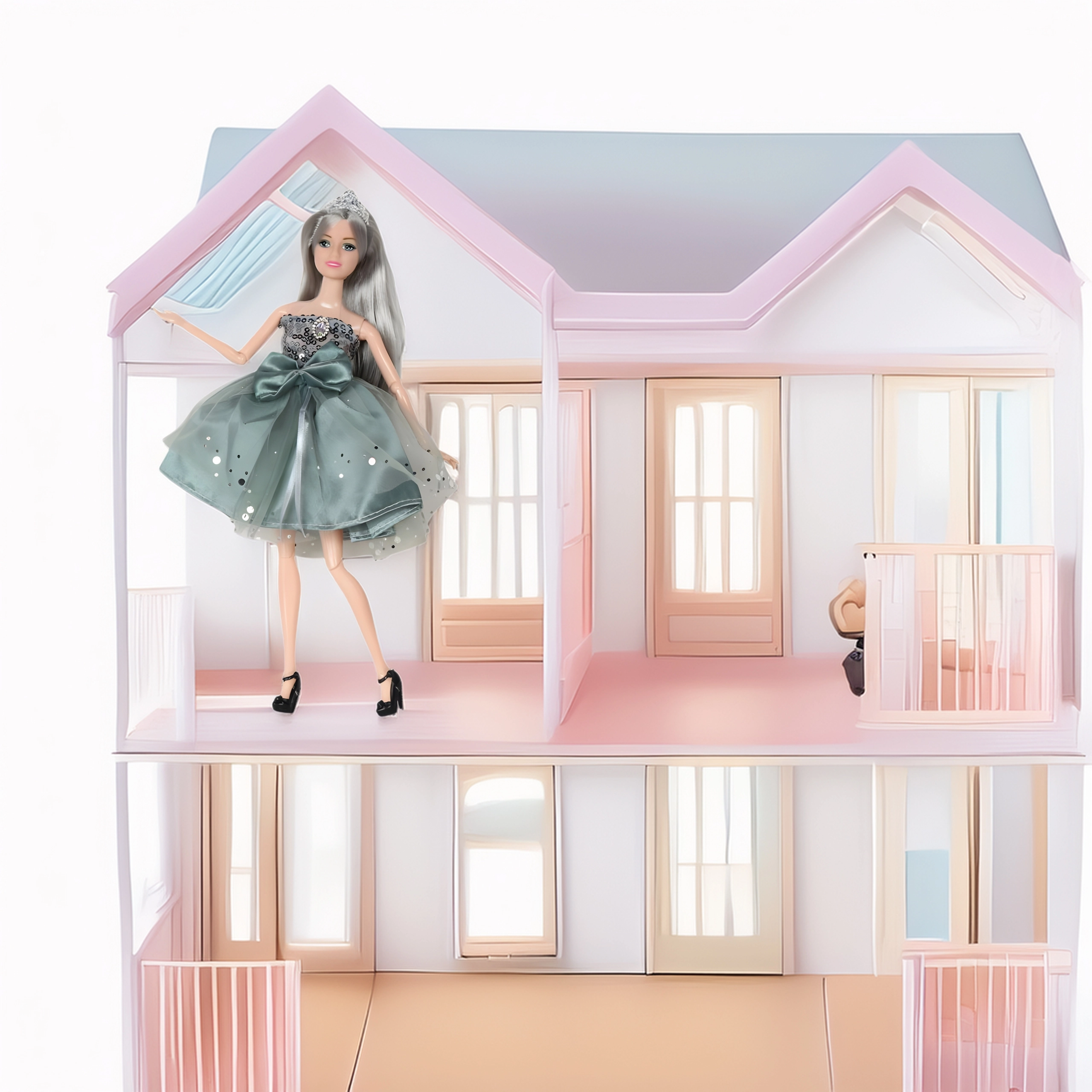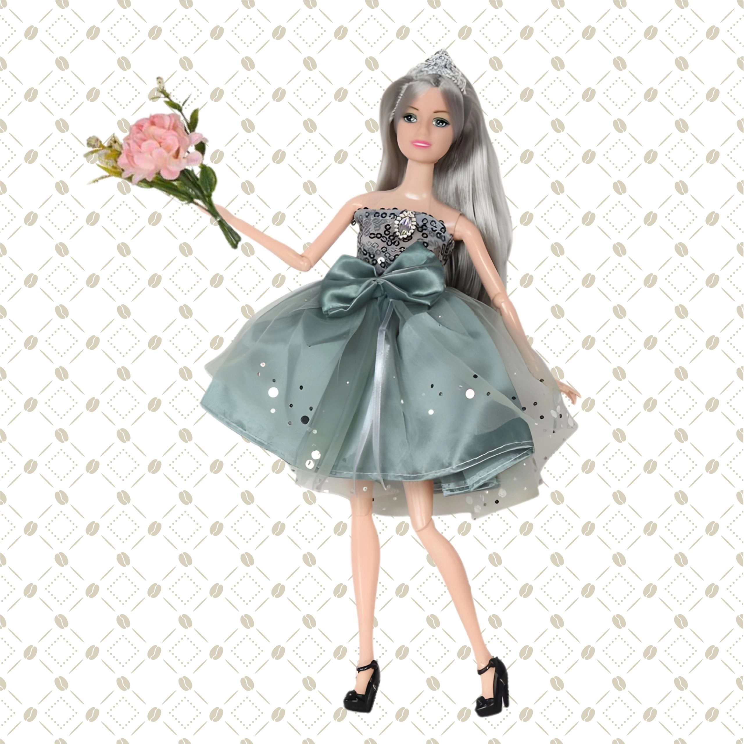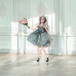 La poupée Emi est conçue pour les enfants qui aiment les accessoires de mode et les histoires imaginaires. Sa robe verte élégante avec un délicat voile en tulle et un nœud accrocheur transforme chaque jeu en un événement raffiné. Ses longs cheveux violets et argentés peuvent être peignés et coiffés de différentes façons, tandis que la couronne et les autres accessoires ajoutent une touche royale à chaque tenue.