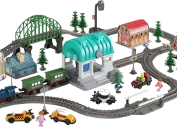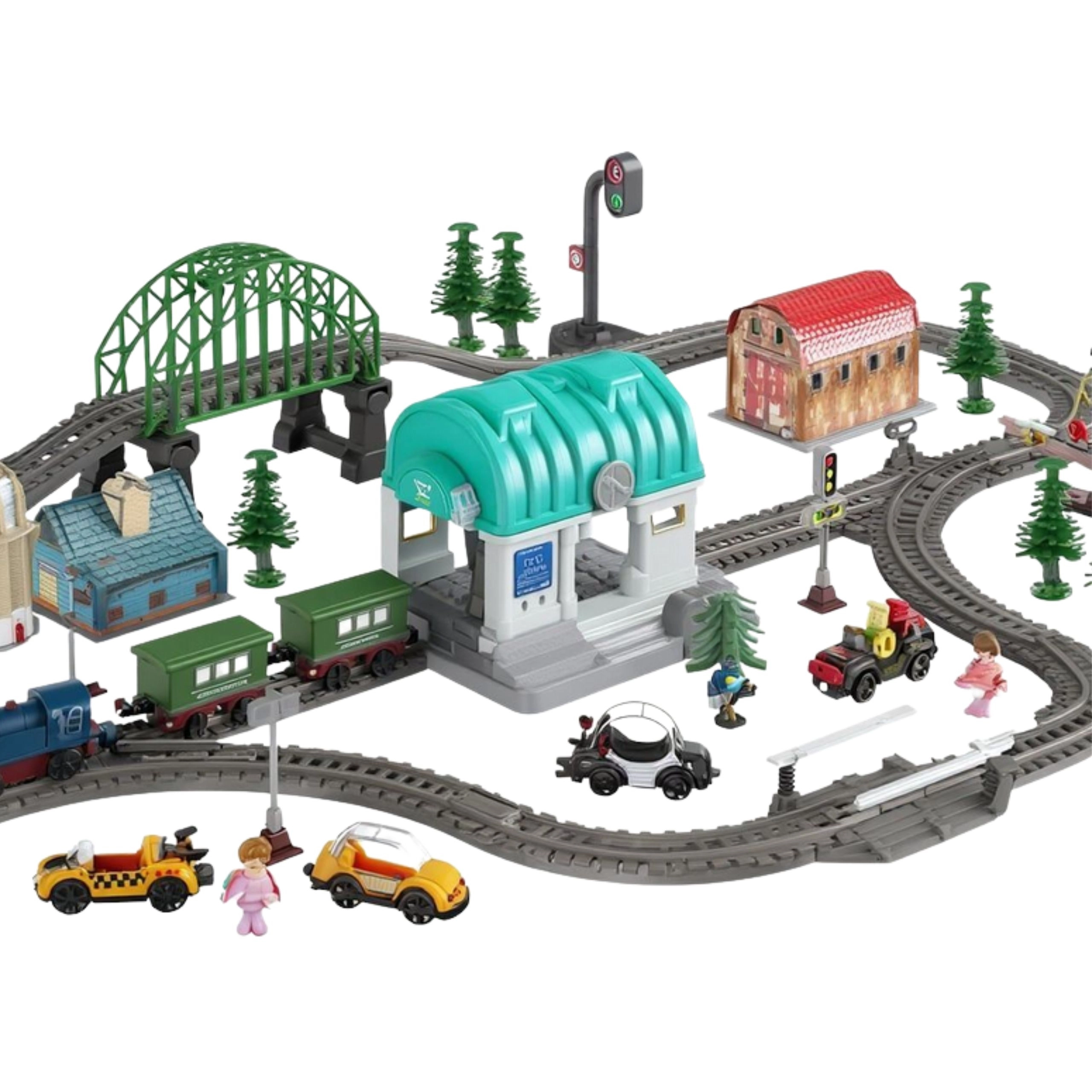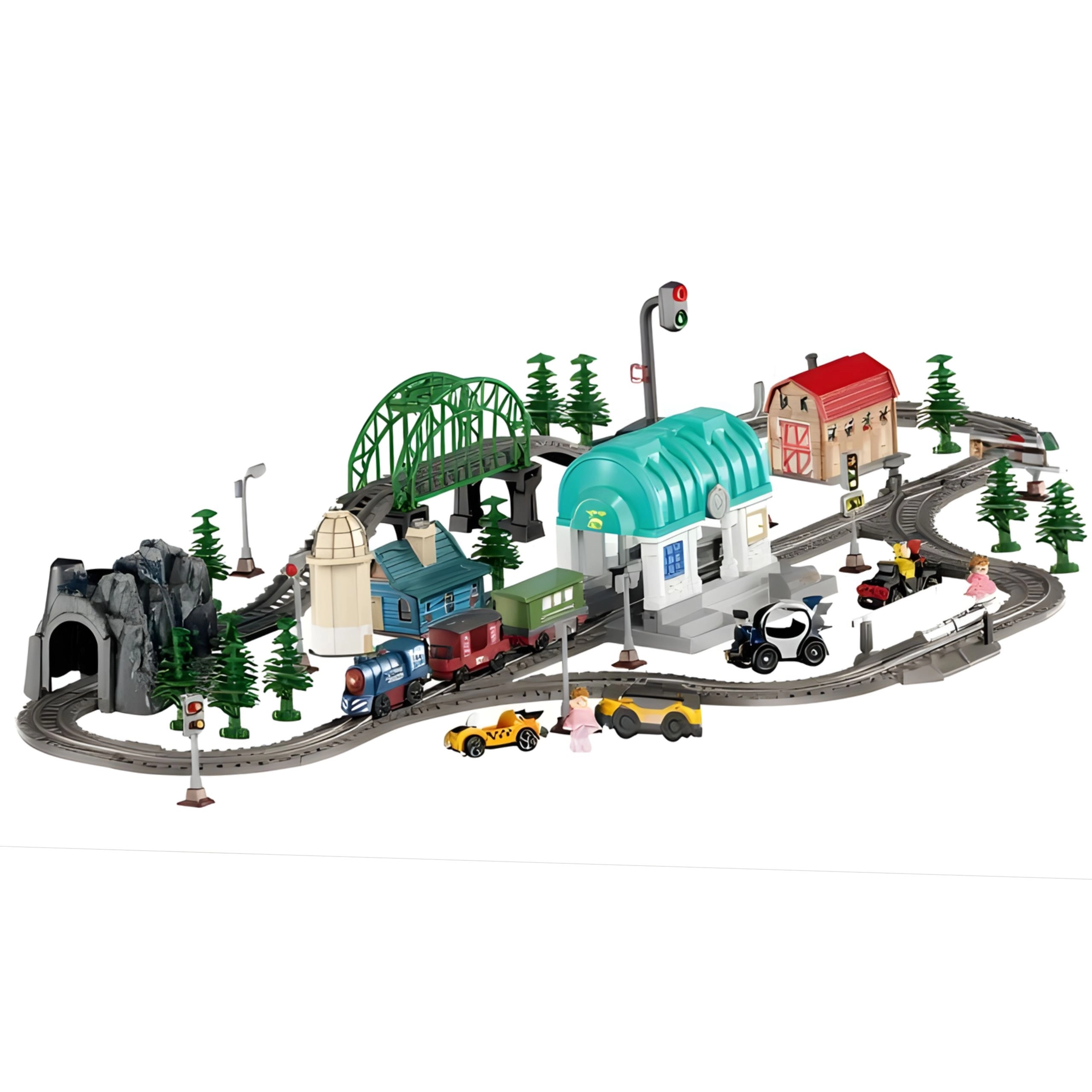 • 108 pièces incluant rails, pont, tunnel, gare, petites voitures, figurines et accessoires