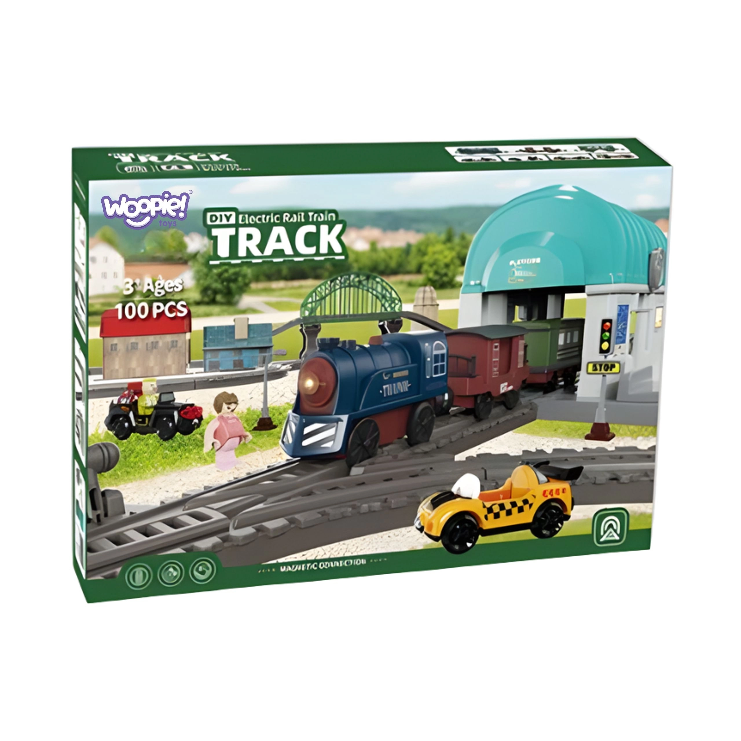 Le vaste circuit de train électrique de WOOPIE offre aux enfants un monde d’imagination sous la forme d’une petite ville avec pont, tunnel et gare. Locomotive avec lumières et sons, attelage magnétique des wagons et 108 pièces pour construire des parcours variés garantissent de longues heures de jeu et de développement créatif. Montage facile, matériaux sûrs et fonctionnement sur piles raviront enfants et parents.