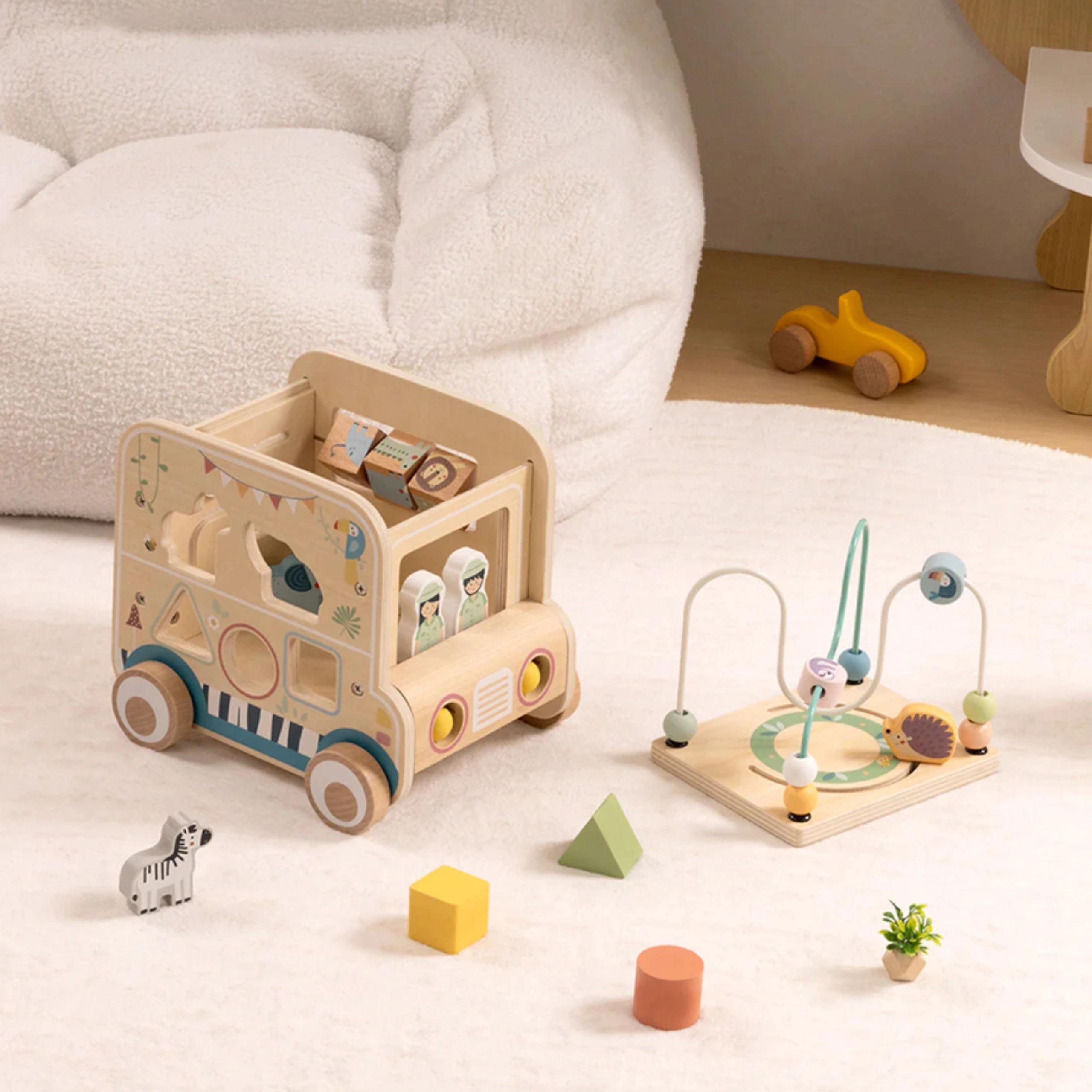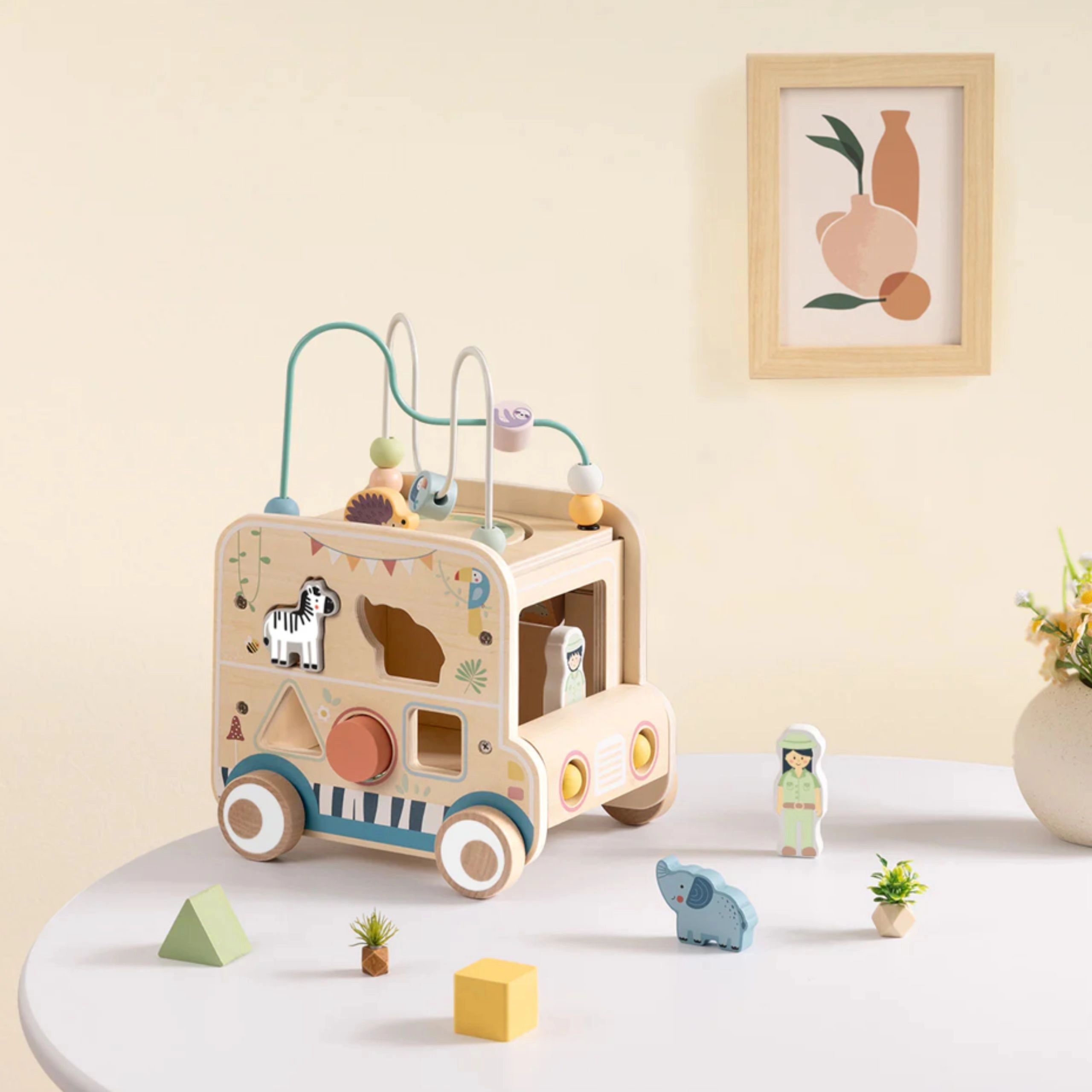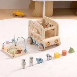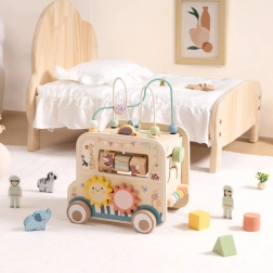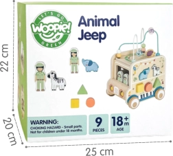 Découvrez un monde ludique avec le cube d’activités en bois en forme de voiture safari de la marque WOOPIE GREEN. Ce jouet multifonction combine un labyrinthe moteur, un tri des formes, des roues dentées rotatives et des blocs illustrés pour développer la motricité fine, la coordination et le jeu créatif des enfants à partir de 18 mois.