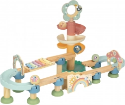 Cette piste à billes de qualité combine mouvement, son et exploration curieuse. Les enfants regardent les billes rouler le long des courbes, franchir les ponts et déclencher la section musicale avec xylophone, ce qui développe le sens du rythme, la concentration et le plaisir de jouer. Les doux tons pastel aux motifs de nature créent une atmosphère apaisante et s’intègrent parfaitement à toute chambre d’enfant.