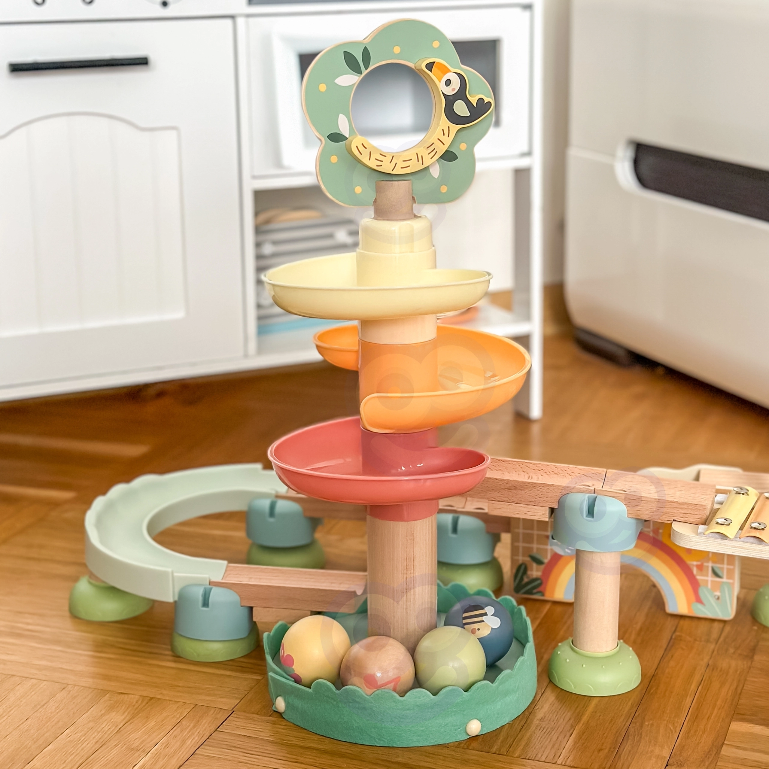 Les spirales à plusieurs niveaux et les rampes courbes assurent un mouvement fluide des billes et aident les enfants à comprendre la gravité et la relation cause–effet.