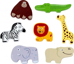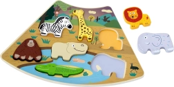 Le puzzle en bois Safari est un jouet idéal pour les premières expériences d’encastrement. Les figurines d’animaux colorées et adorables – zèbre, girafe, lion, gorille/orang-outan, hippopotame, éléphant et crocodile – ont des formes épaisses et faciles à saisir qui facilitent la manipulation. La base illustrant une scène de savane aide à la perception spatiale et à la reconnaissance des formes, car chaque pièce a son emplacement précis.