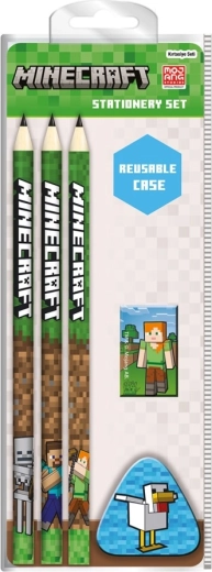 Un set scolaire pratique sous licence Minecraft ravira tout fan et écolier. Il contient tout le nécessaire pour écrire et dessiner : règle 15 cm, gomme, taille-crayon, stylo et crayon HB.