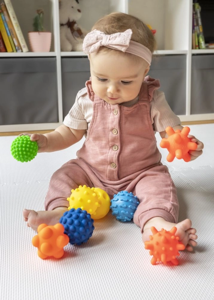Chaque balle offre une surface différente – picots, bosses et rainures pour une stimulation tactile intense et le plaisir de la découverte.