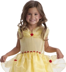 Une jupe jaune ample à plusieurs couches et des petites roses rouges décoratives créent un look charmant inspiré de Belle.