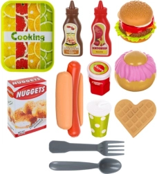 plateau, ketchup, sauce chocolat, pain à hot-dog, saucisse, couverts (cuillère, couteau, fourchette), nuggets, confiture, gobelet avec paille, boîte à frites, 5× frites, 2× pains à burger, gaufre, oignon, salade, tomate, steak haché, fromage, cupcake, nappage