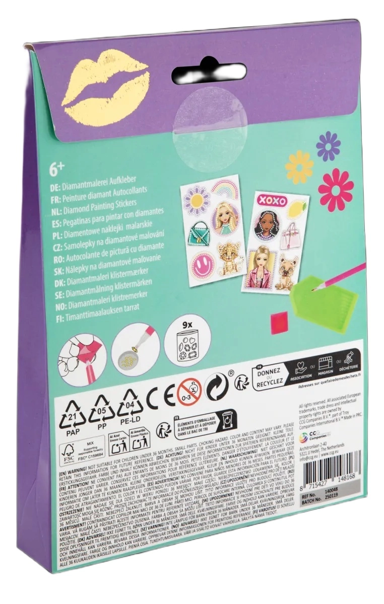 - 12 autocollants, strass/diamants, stylet d’application, pastille adhésive, plateau