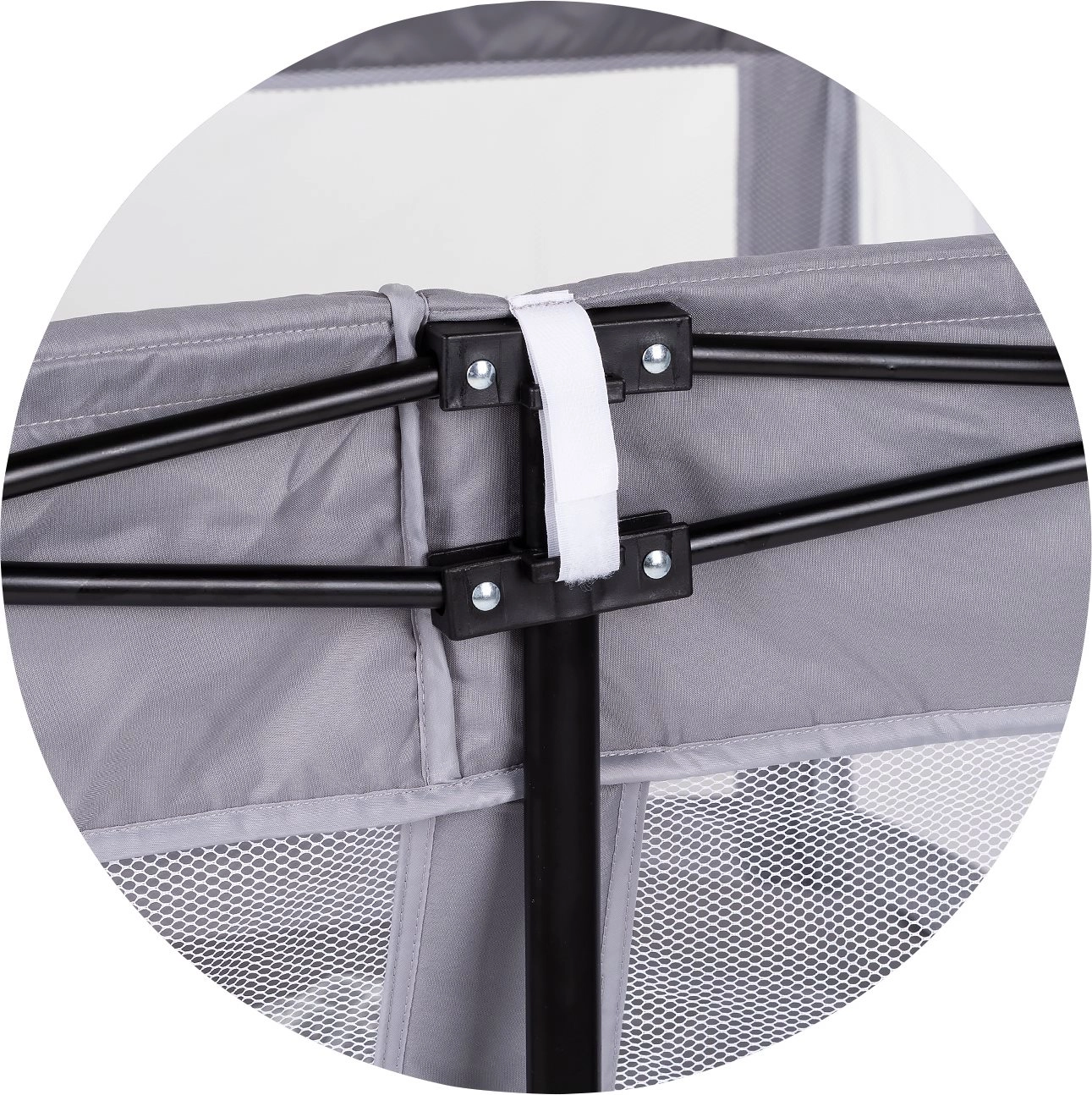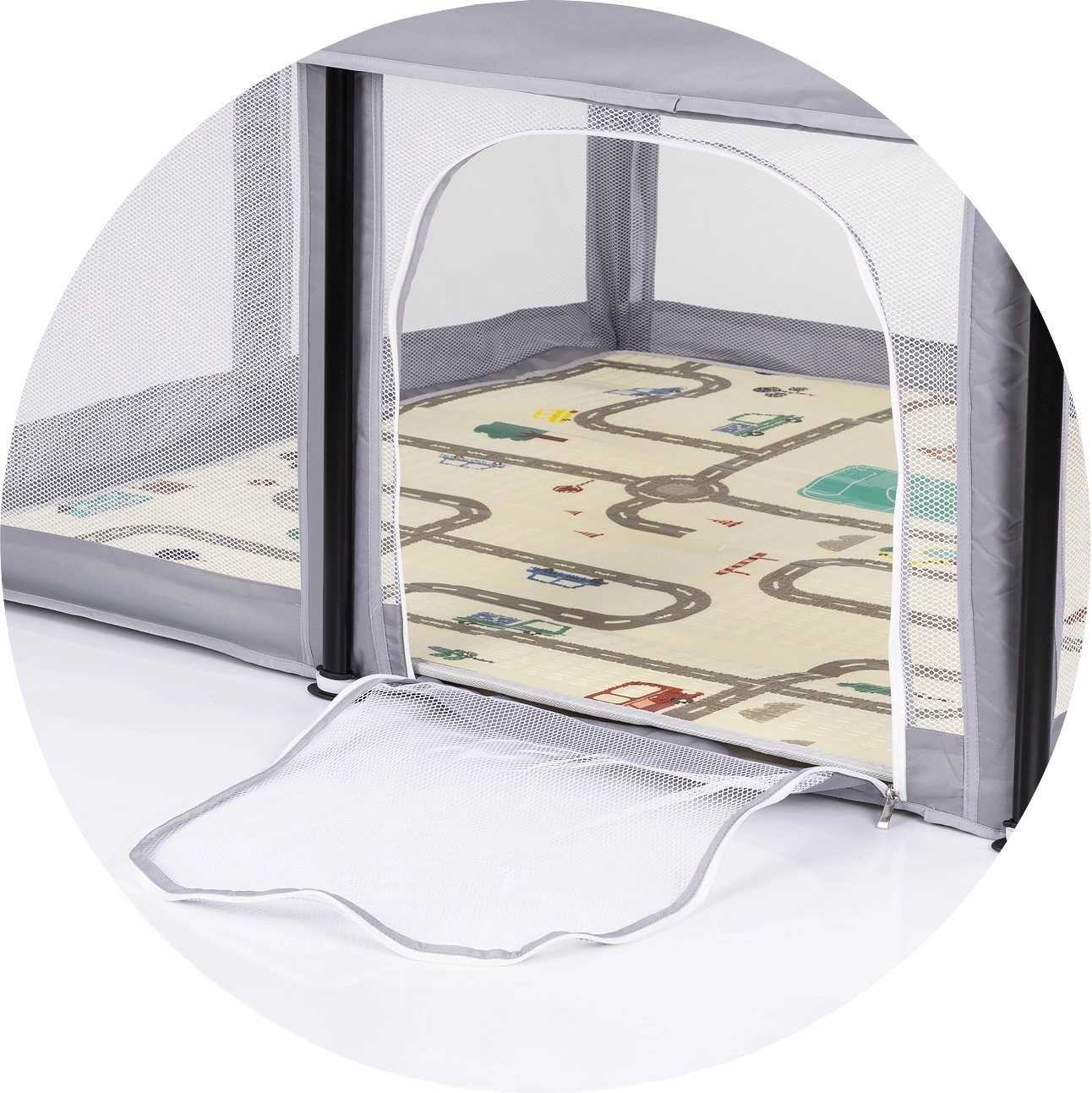 Les panneaux en mesh assurent la circulation de l’air, le contact visuel et la tranquillité pour l’enfant comme pour les parents.