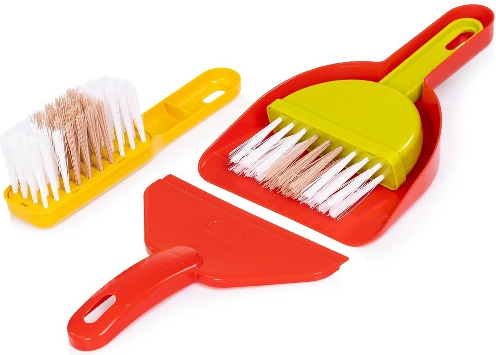 Le set comprend un large éventail d’accessoires : aspirateur, mop, balai, balayette et pelle, pulvérisateur, éponge et chiffons, éventuellement aussi un panneau de signalisation et une corbeille. Tout est adapté aux mains des enfants pour une prise en main sûre et un rangement facile sur le chariot. Des matériaux de qualité garantissent une longue durée de vie même en cas d’utilisation fréquente.