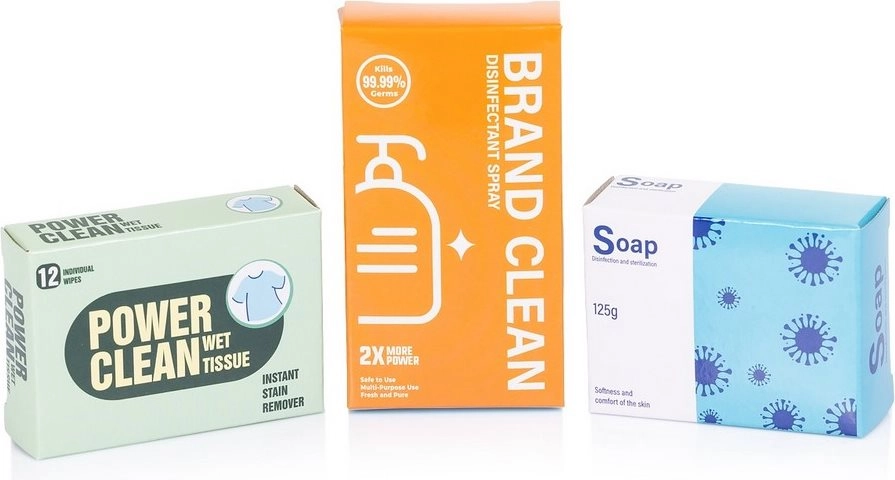 Chariot, aspirateur, mop, balai, balayette et pelle, pulvérisateur, éponge/chiffons, corbeille, panneau de signalisation (selon la variante)