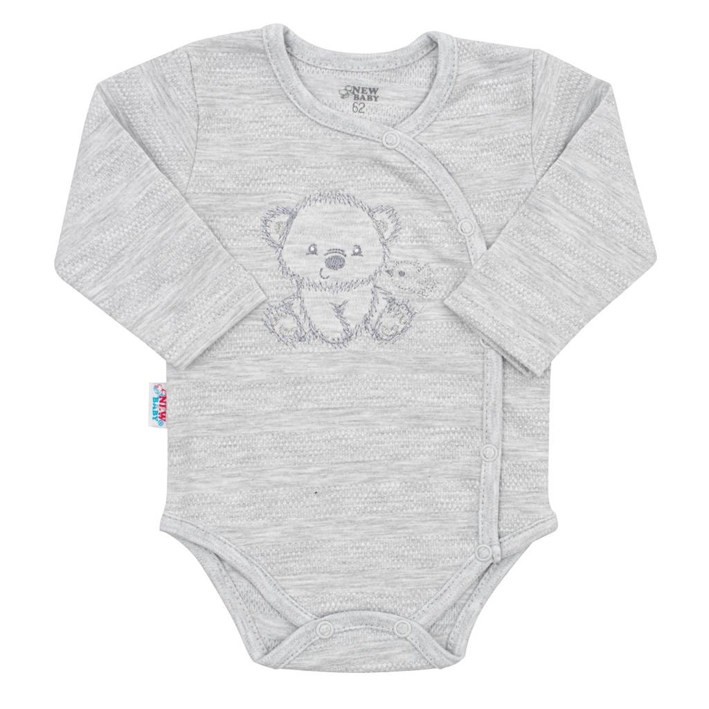Adorable ensemble naissance NEW BABY Sweet Bear dans une élégante couleur grise, idéal pour la maternité et les premières semaines à la maison. Il comprend un body croisé à manches longues, une grenouillère, une veste et un bonnet à nouer. La 100 % coton toute douce est délicate pour la peau sensible de bébé, les pressions pratiques facilitent le change et l’habillage, et les motifs ours brodés apportent une touche de charme.