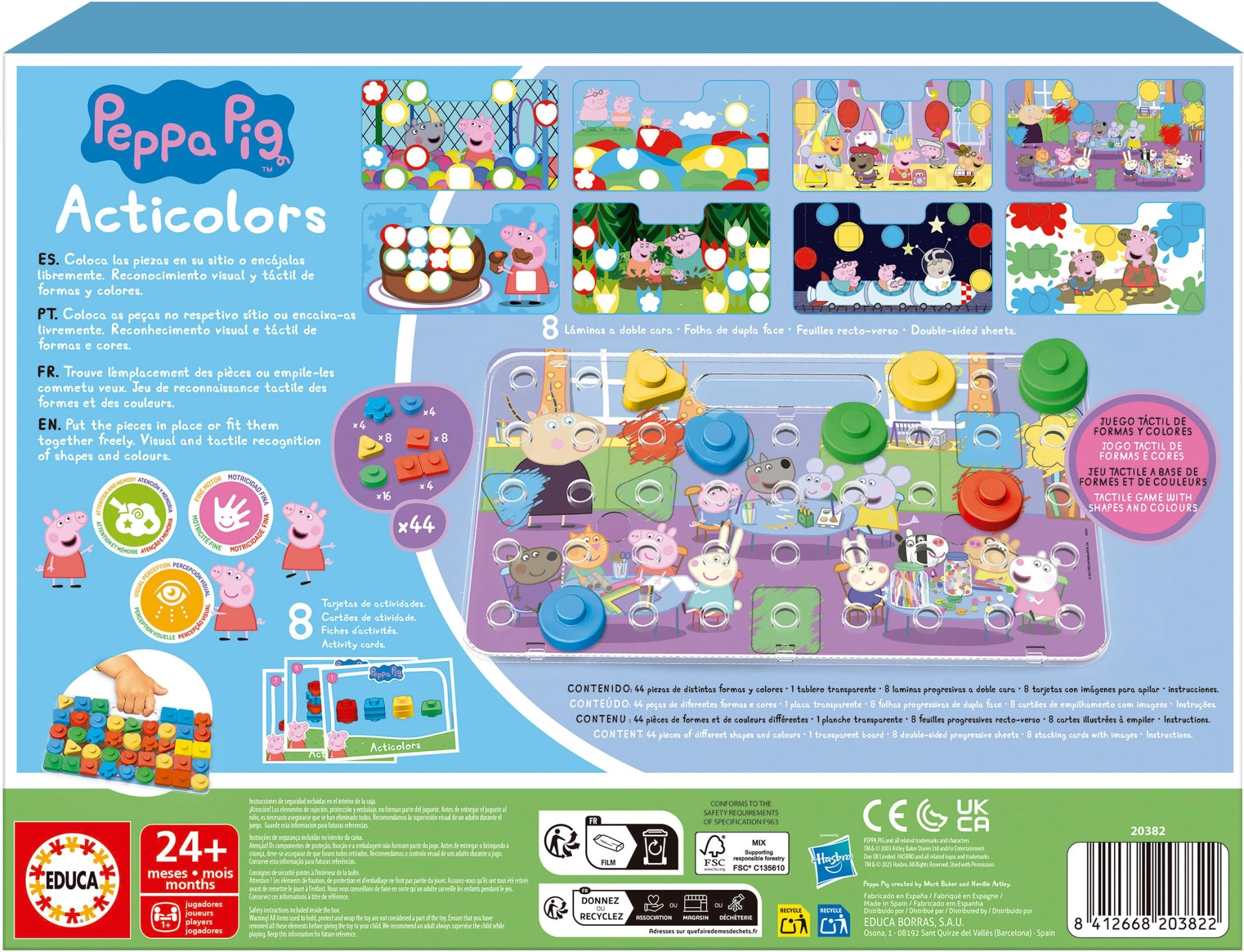 Explorez le monde des couleurs et des formes avec les personnages préférés de PEPPA PIG. Le jeu didactique EDUCA Acticolors est conçu pour les tout-petits afin d’apprendre en jouant : ils associent les pièces aux modèles, exercent la coordination œil–main et renforcent la pensée logique. Grâce à des composants solides et à une plaque pratique avec poignée, le jeu est confortable à la maison comme en déplacement.