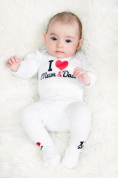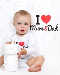 Adorable body pour bébé à manches longues de la marque New Baby avec l’inscription I Love Mum and Dad. Fabriqué en 100 % coton pour la peau délicate des enfants, avec une fermeture à pressions à l’épaule et entre les jambes. Les couleurs certifiées sûres garantissent la douceur pour le bébé.