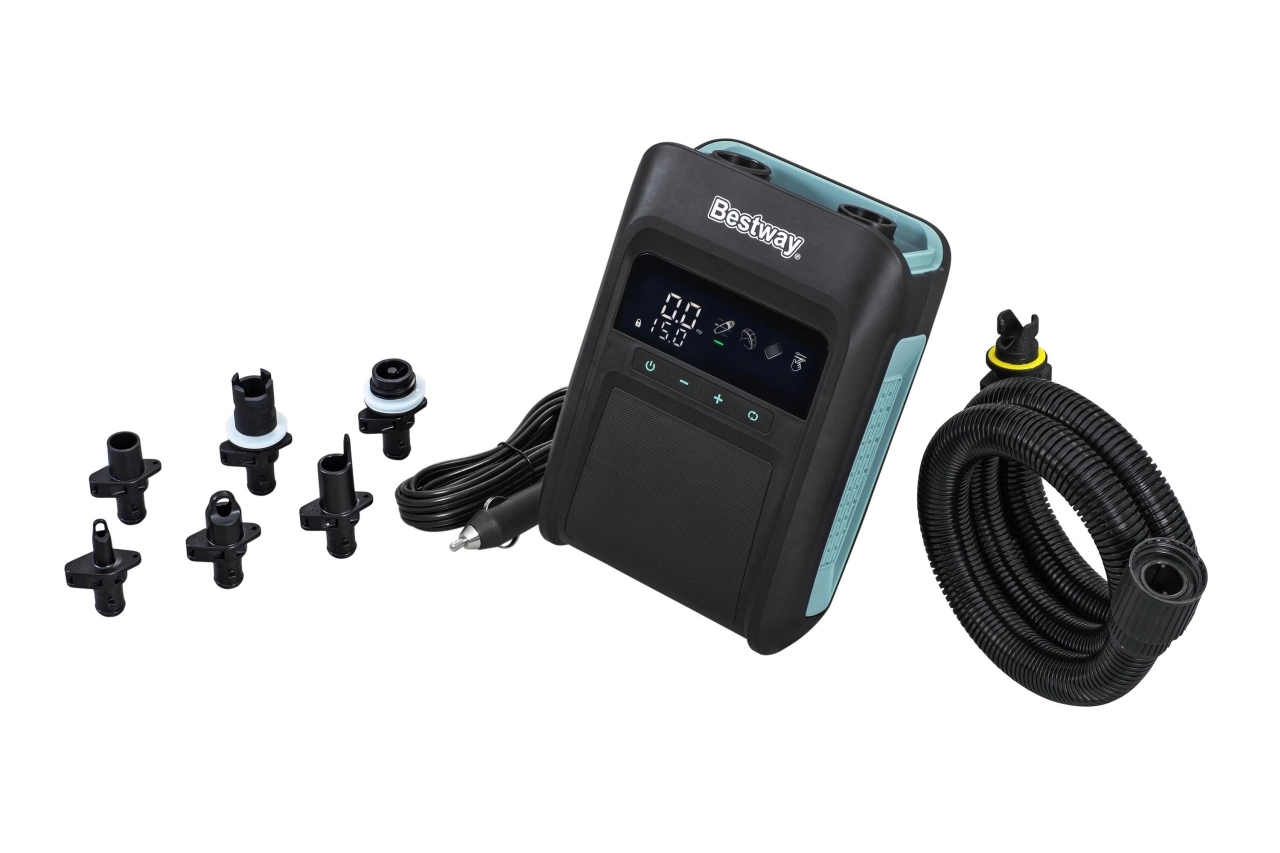 Pompe électrique BESTWAY PowerGrip 12 V performante avec écran numérique, arrêt automatique et pression max. 20 PSI, gonfle rapidement SUP, bateaux et rafts. Elle offre un double moteur, des modes basse et haute pression et un réglage précis par paliers de 0,1 PSI.